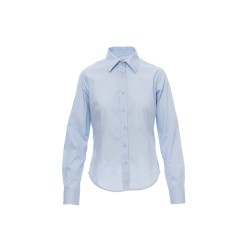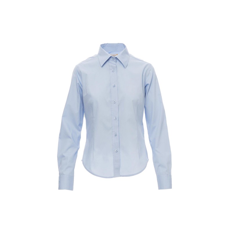 Chemise femme, fil de coton peigné très fin, coupe cintrée, pinces de reprise devant et derrière, col italien, poignets profilés avec deux boutons et une boutonnière, patte de boutonnage visible et boutons teinte assortie . Empiècement dans le dos. Tissu traité Easy Care.