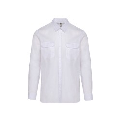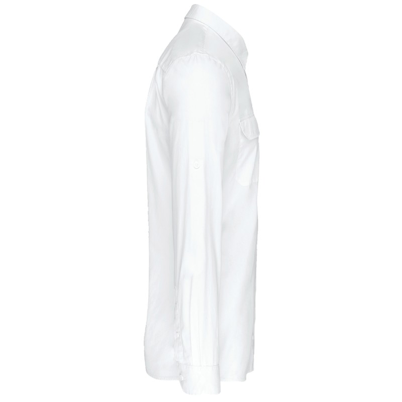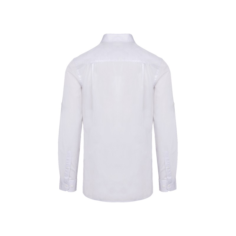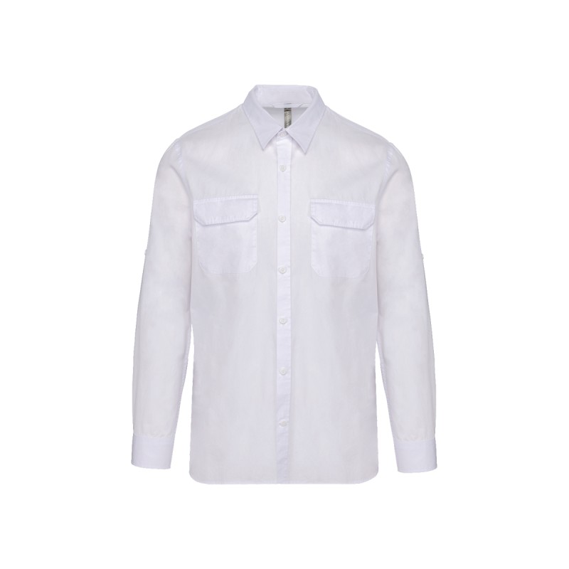 100% coton. Tissu popeline. Col non boutonné. 2 poches plaquées avec rabat devant. Poignets réglables avec patte de manche capucin boutonnée. Manches retroussables à l'aide d'une patte boutonnée. Chemise lavée. Ce produit a subi un traitement spécial et présente un aspect volontairement vieilli. Ce procédé de fabrication implique des variations de couleurs d'un produit à l'autre et rend chaque pièce unique.
