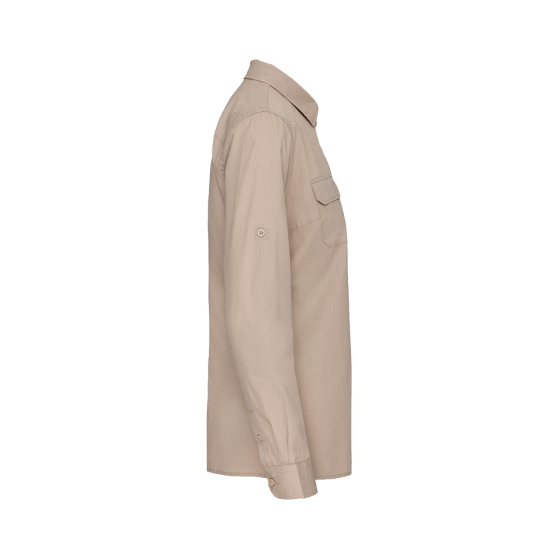 100% coton. Tissu popeline. Col non boutonné. 2 poches plaquées avec rabat devant. Poignets réglables avec patte de manche capucin boutonnée. Manches retroussables à l'aide d'une patte boutonnée. Chemise lavée. Ce produit a subi un traitement spécial et présente un aspect volontairement vieilli. Ce procédé de fabrication implique des variations de couleurs d'un produit à l'autre et rend chaque pièce unique.