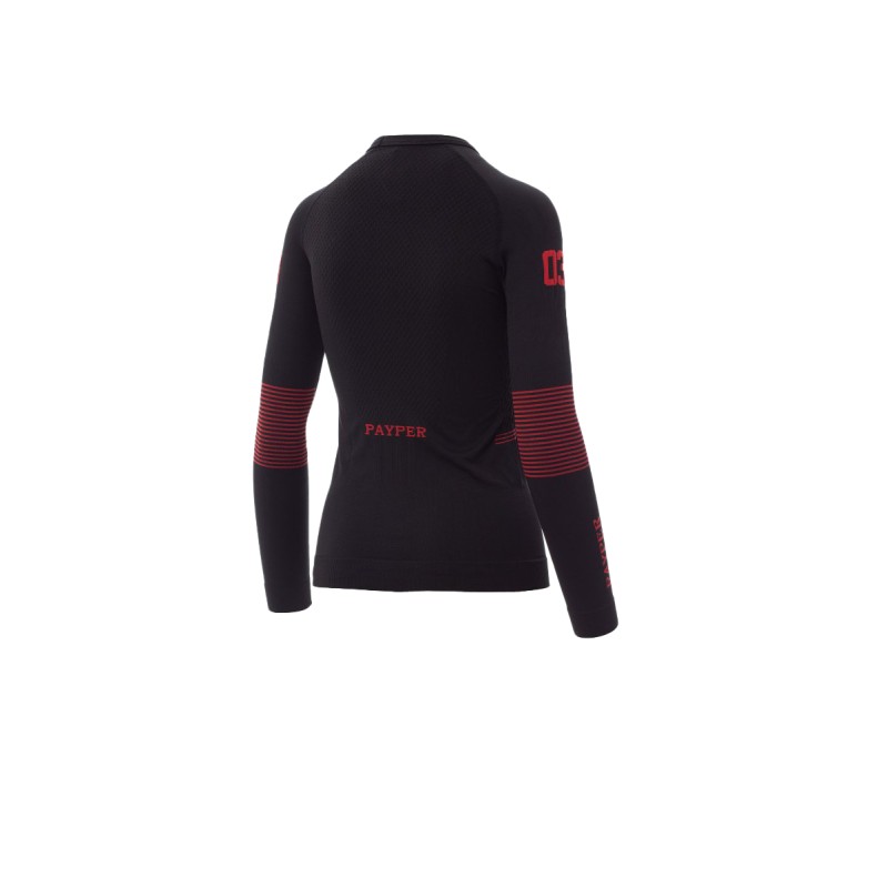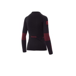 Tricot thermique femme, encolure ras le cou, manches longues raglan. Tissu souple et élastique, avec tissages spéciaux sur la poitrine et le dos, motifs à hélice en relief sur les côtés pour garantir une transpiration correcte et une thermorégulation constante. Col, bas et ourlets des manches en bord côtes de la même matière, pour un meilleur confort. Structure tubulaire ergonomique et nervures spéciales sur les coudes pour s'adapter parfaitement à la physionomie du corps.