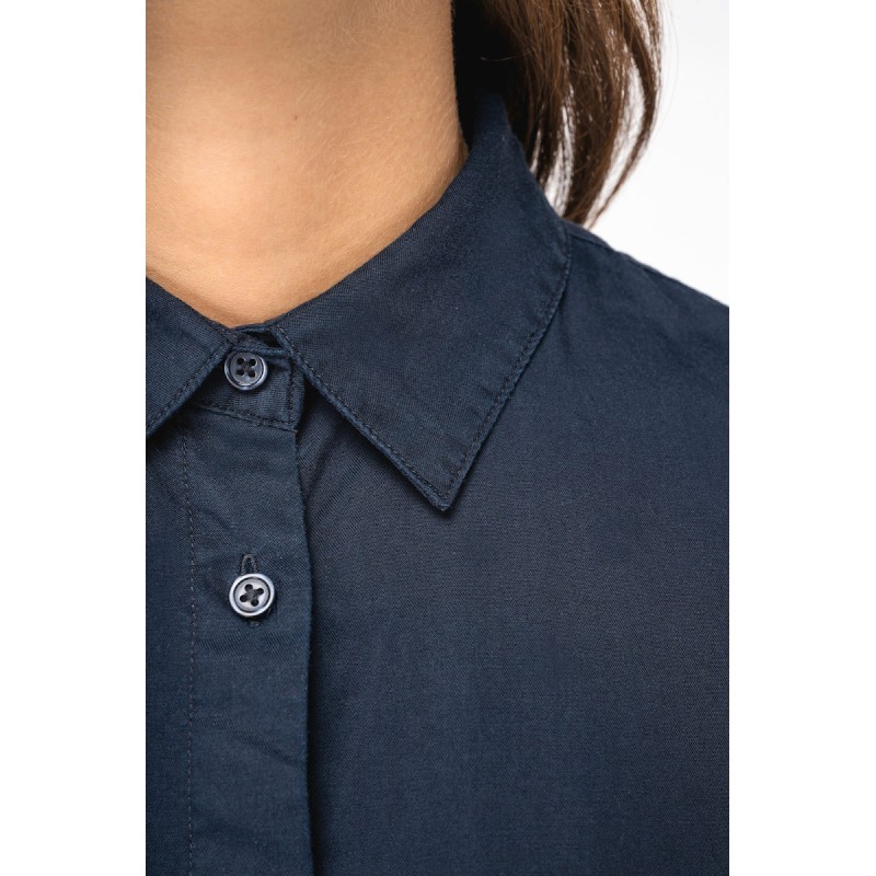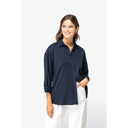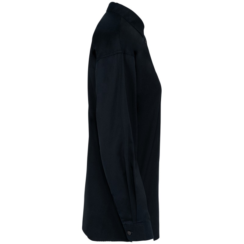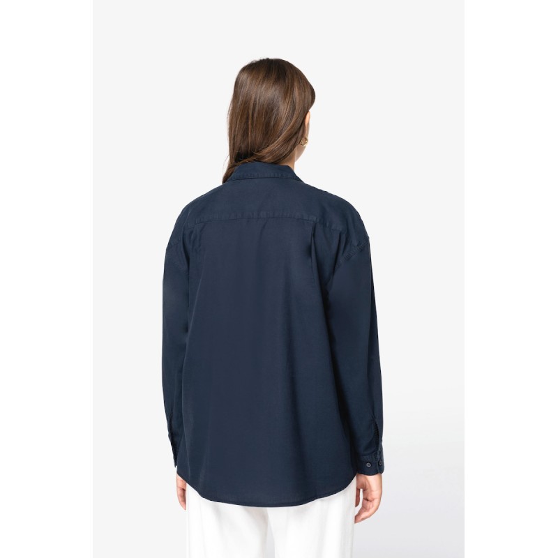 60% Lyocell TENCEL™* / 40% coton biologique. Coupe loose légèrement évasée. Lavé aux enzymes. Boutons en plastique recyclé ton sur ton. Manches longues deux plis. Empiècement au dos. Deux plis d’aisance au dos. Poignets boutonnés avec fentes. Vêtement lavé après montage : les couleurs peuvent légèrement varier.  Ce produit est susceptible de déteindre au contact avec des surfaces ou vêtements clairs. * TENCEL™ est une marque de Lenzing AG.
