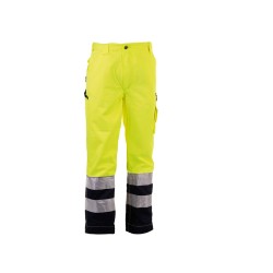 Pantalon multi-poches déperlant. Bandes réfléchissantes de 7 cm autour des chevilles. Taille ajustable.