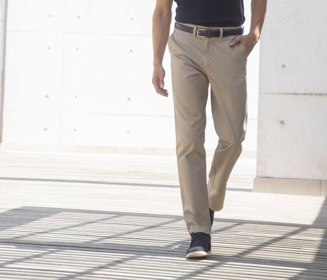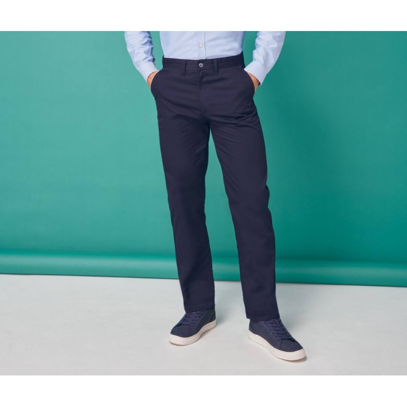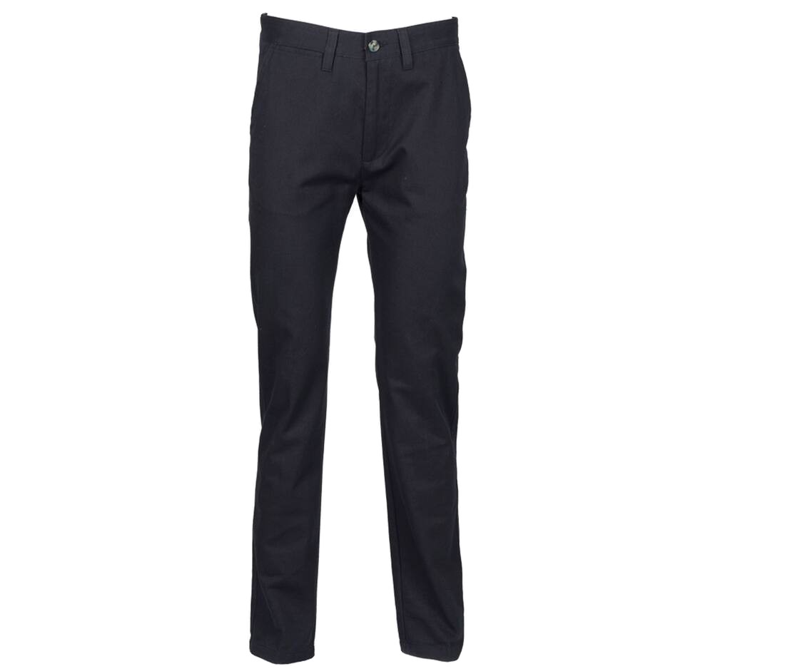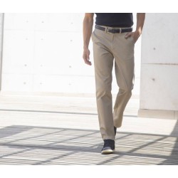 Pantalon sans pince sur le devant. Coupe droite. 2 poches à l'arrière avec bouton.