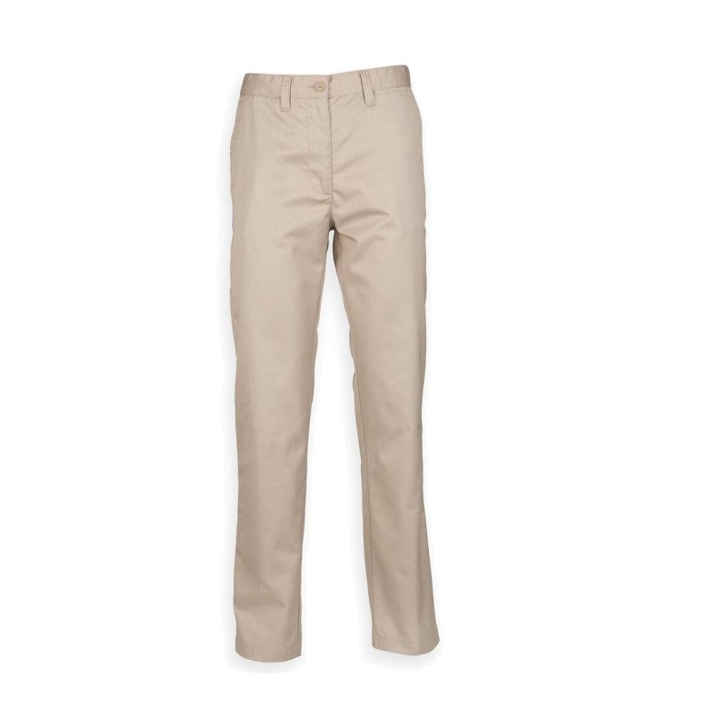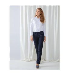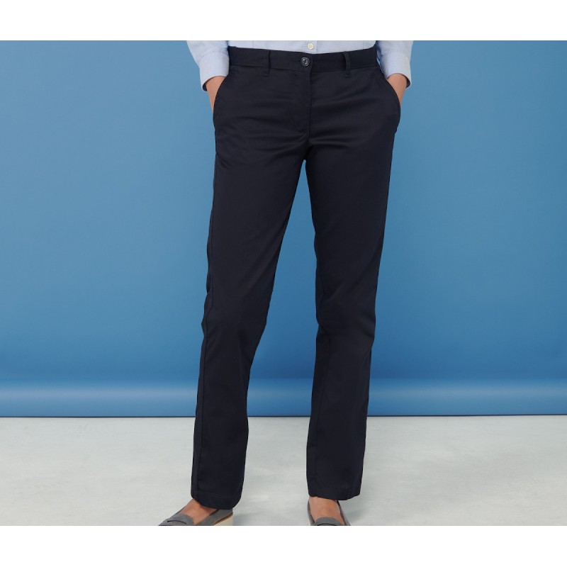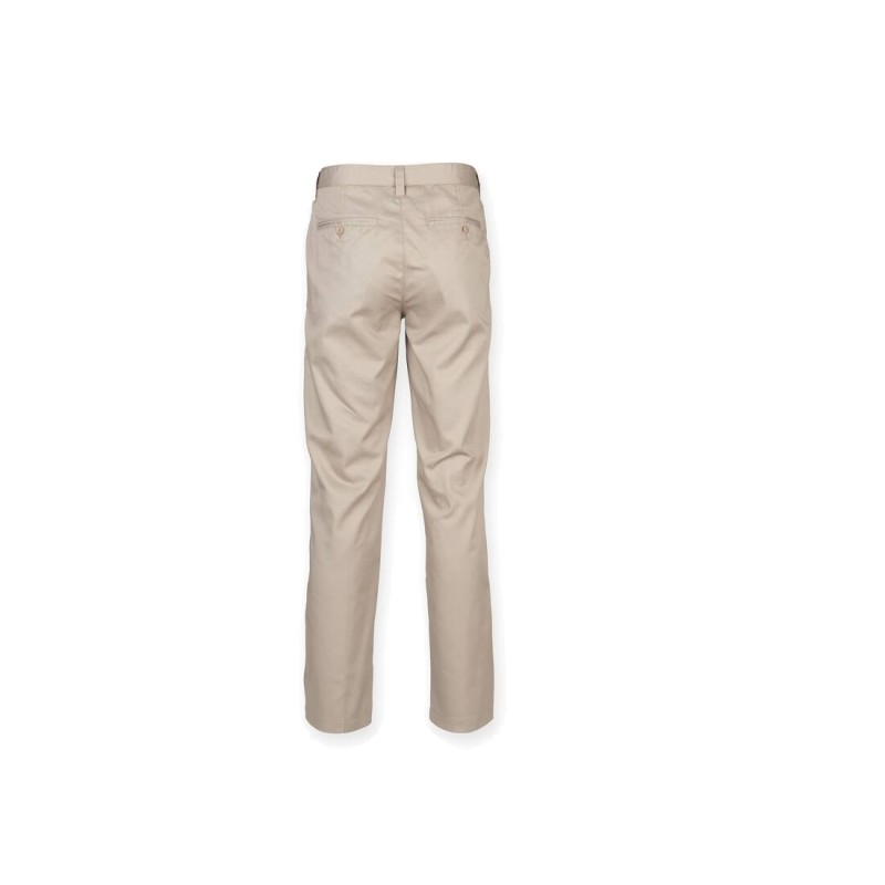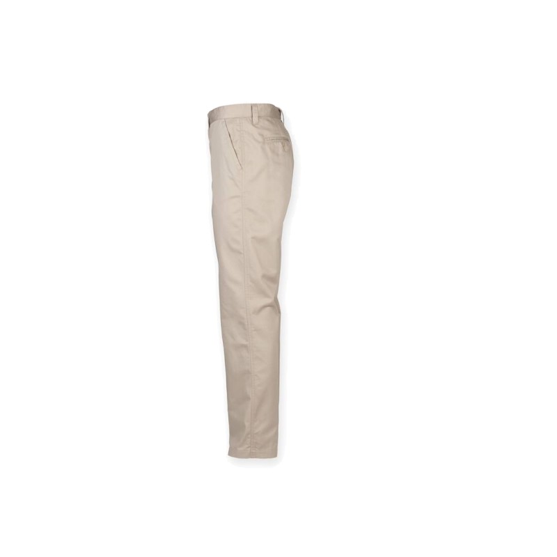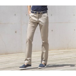 Pantalon sans pince sur le devant. Coupe droite. 2 poches à l'arrière avec des boutons.
