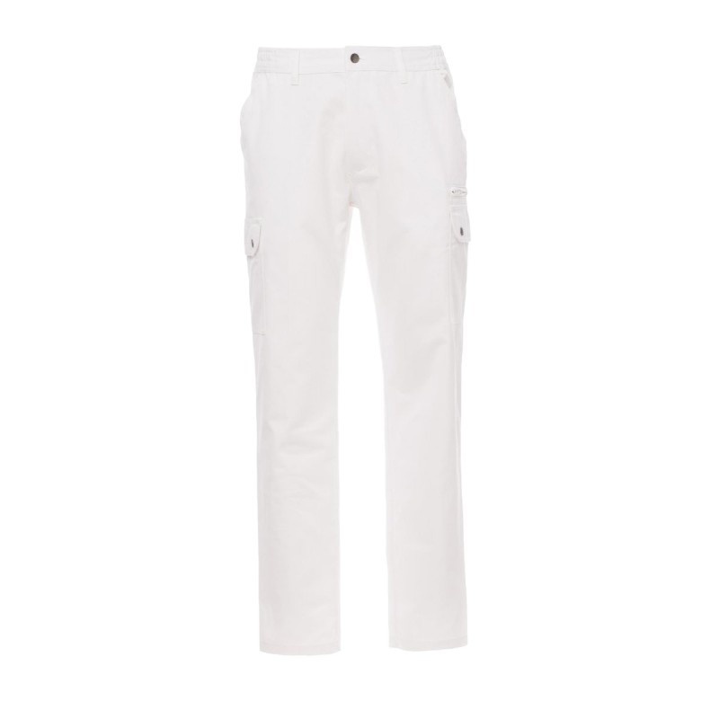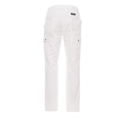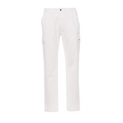 Pantalon homme multi-saison avec élastiques latéraux et passants à la taille, fermeture par zip et bouton en métal, deux poches de coupe classique sur le devant, deux poches latérales avec rabat et boutons-pression, une poche avec zip côté gauche, un porte-mètre escamotable côté droit, deux poches arrière passepoilées avec boutonnière et bouton.