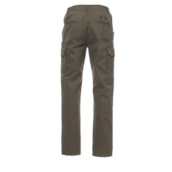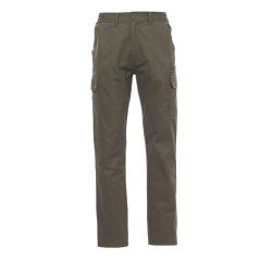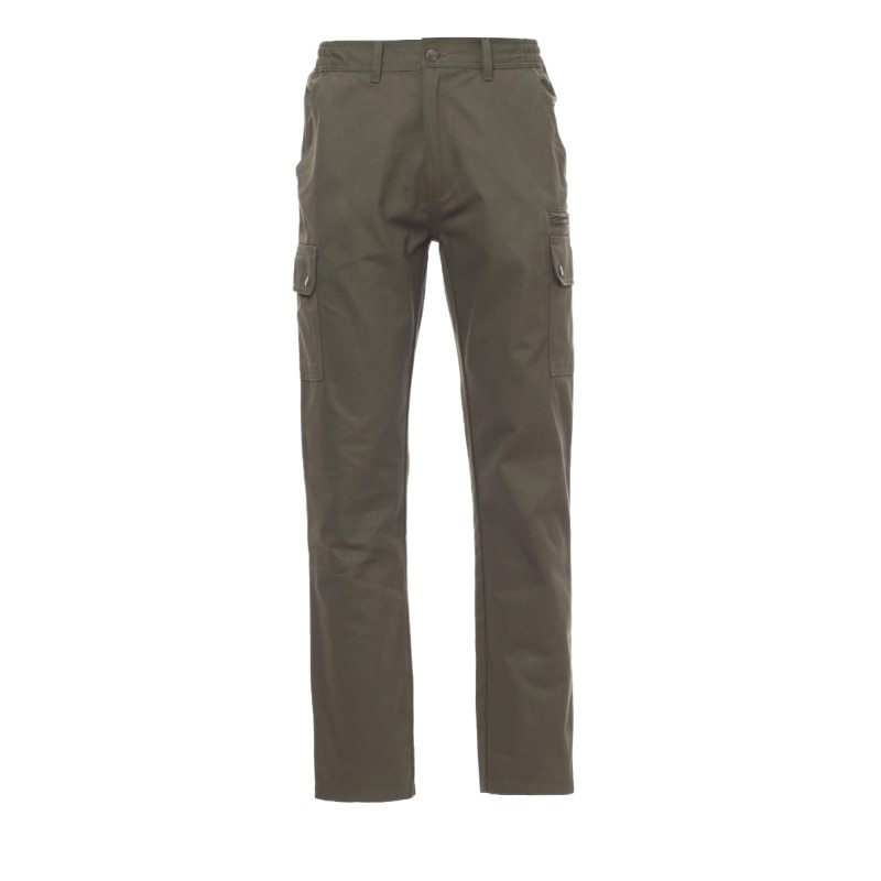 Pantalon homme multi-saison avec élastiques latéraux et passants à la taille, fermeture par zip et bouton en métal, deux poches de coupe classique sur le devant, deux poches latérales avec rabat et boutons-pression, une poche avec zip côté gauche, un porte-mètre escamotable côté droit, deux poches arrière passepoilées avec boutonnière et bouton.