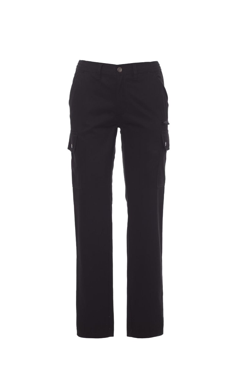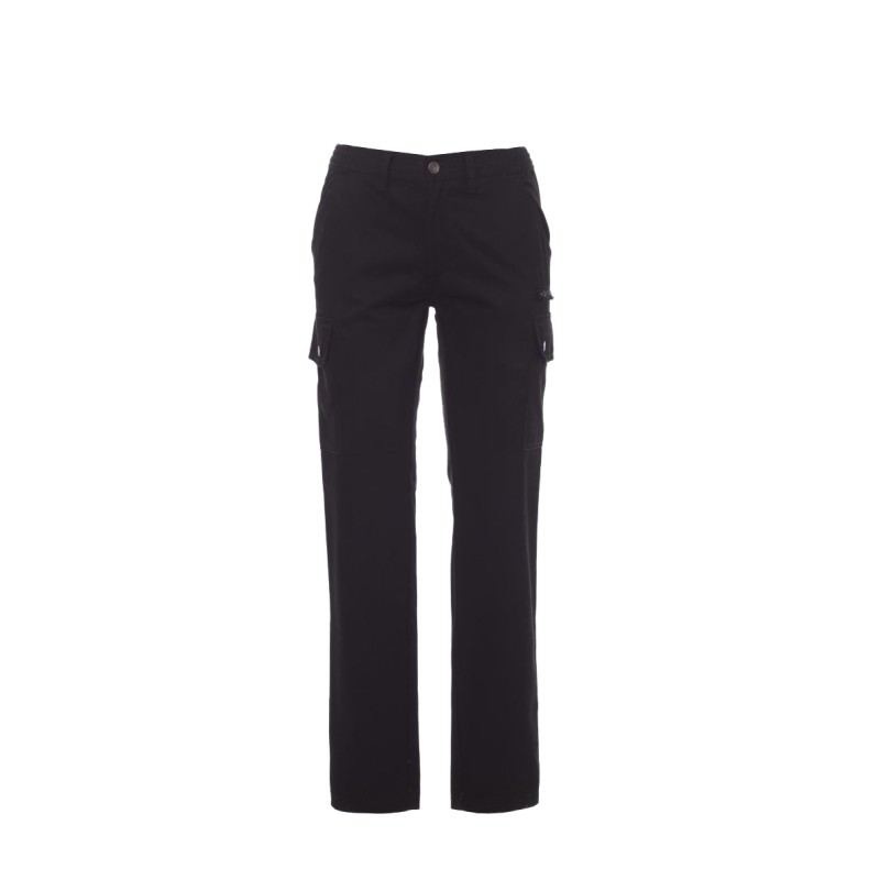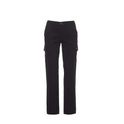Pantalon multi-saison de coupe classique pour femme, avec élastiques latéraux et passants à la taille, fermeture par zip et bouton en métal, deux poches de coupe classique sur le devant, deux poches latérales avec rabat et boutons-pression, une poche avec zip côté gauche, un porte-mètre escamotable côté droit, deux poches arrière passepoilées avec boutonnière et bouton.