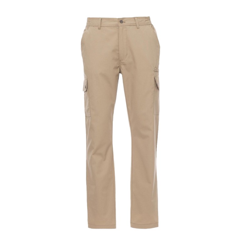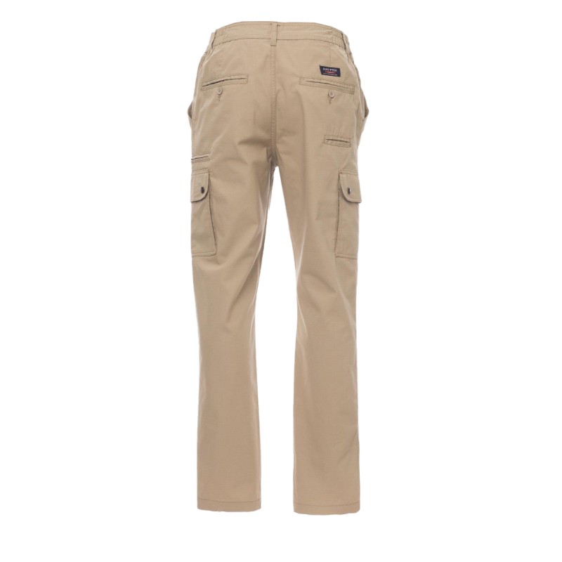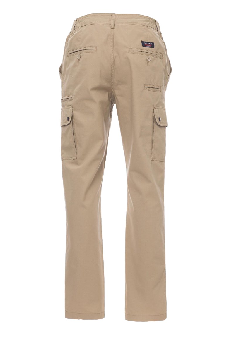 Pantalon d'été pour homme, avec élastiques latéraux et passants à la taille, fermeture par zip et bouton en métal, deux poches de coupe classique sur le devant, deux poches latérales avec rabat et boutons-pression, une poche avec zip côté gauche, un porte-mètre escamotable côté droit, deux poches arrière passepoilées avec boutonnière et bouton.