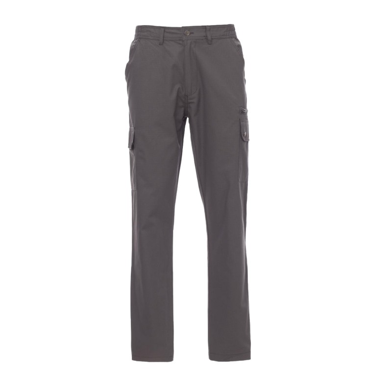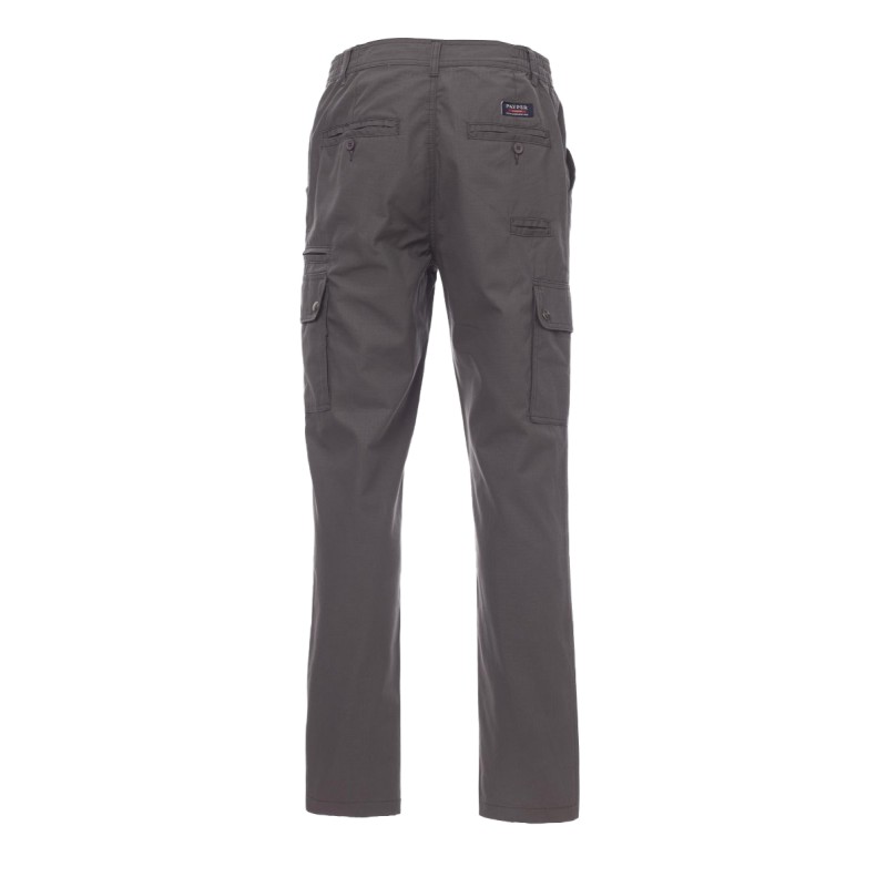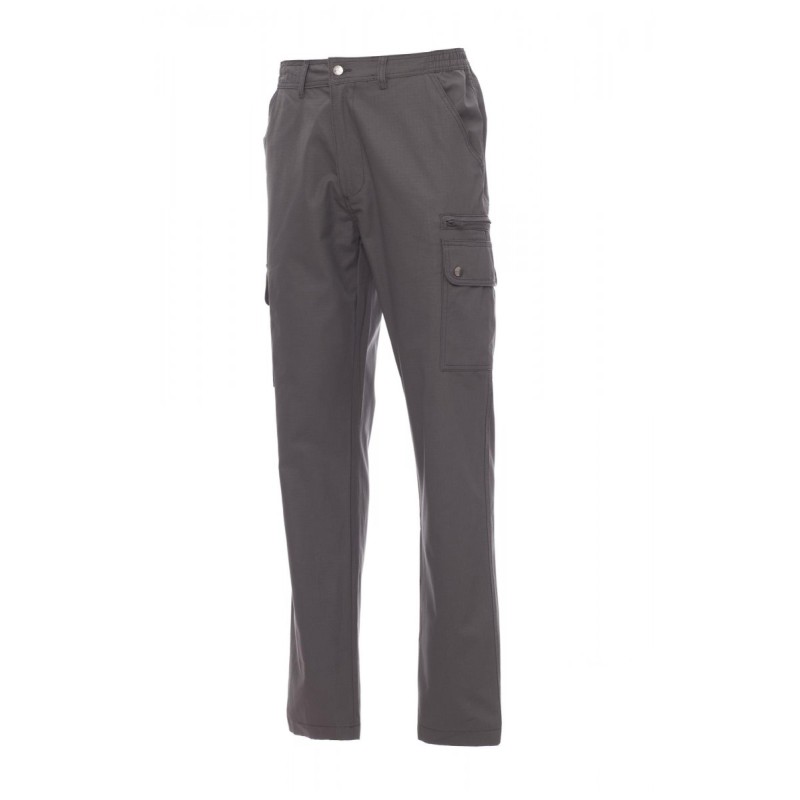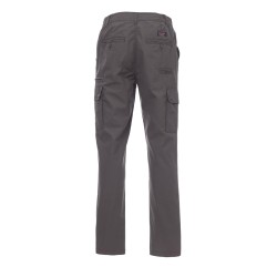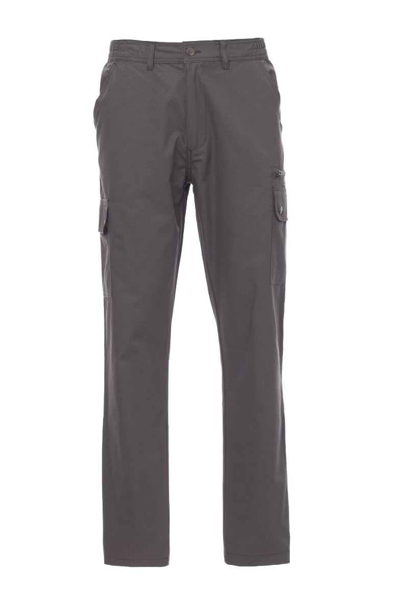 Pantalon d'été pour homme, avec élastiques latéraux et passants à la taille, fermeture par zip et bouton en métal, deux poches de coupe classique sur le devant, deux poches latérales avec rabat et boutons-pression, une poche avec zip côté gauche, un porte-mètre escamotable côté droit, deux poches arrière passepoilées avec boutonnière et bouton.