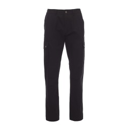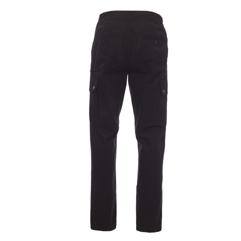 Pantalon d'été pour homme, avec élastiques latéraux et passants à la taille, fermeture par zip et bouton en métal, deux poches de coupe classique sur le devant, deux poches latérales avec rabat et boutons-pression, une poche avec zip côté gauche, un porte-mètre escamotable côté droit, deux poches arrière passepoilées avec boutonnière et bouton.