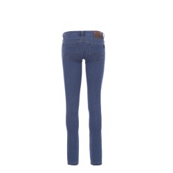 Pantalon femme coupe jeans à cinq poches, fermeture par zip en métal et bouton, passants à la taille, finition « lavage à la pierre » pour un effet usé et délavé. Coutures en gros fil contrasté, doubles coutures sur intérieur des jambes, jambe tube, clous et patchs en cuir véritable. Poids du tissu : 12oz/yd².