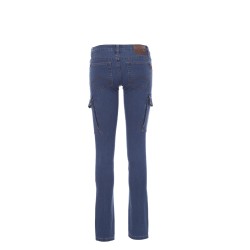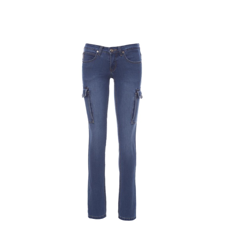 Pantalon femme, coupe jeans à cinq poches, deux poches latérales LOCK SYSTEM à petit soufflet, fermeture par zip en métal et bouton, passants à la taille, finition « lavage à la pierre » pour un effet usé et délavé. Coutures en gros fil contrasté, doubles coutures sur intérieur des jambes, jambe tube, clous et patchs en cuir véritable. Poids du tissu : 12oz/yd².