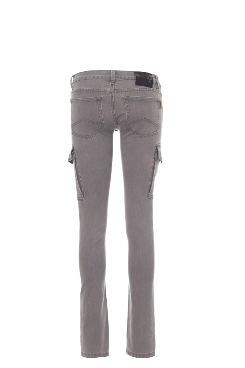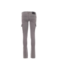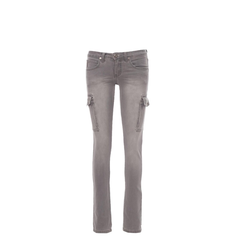 Pantalon femme, coupe jeans à cinq poches, deux poches latérales LOCK SYSTEM à petit soufflet, fermeture par zip en métal et bouton, passants à la taille, finition « lavage à la pierre » pour un effet usé et délavé. Coutures en gros fil contrasté, doubles coutures sur intérieur des jambes, jambe tube, clous et patchs en cuir véritable. Poids du tissu : 12oz/yd².