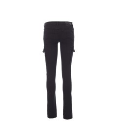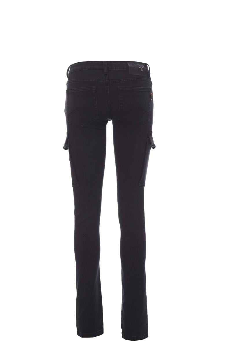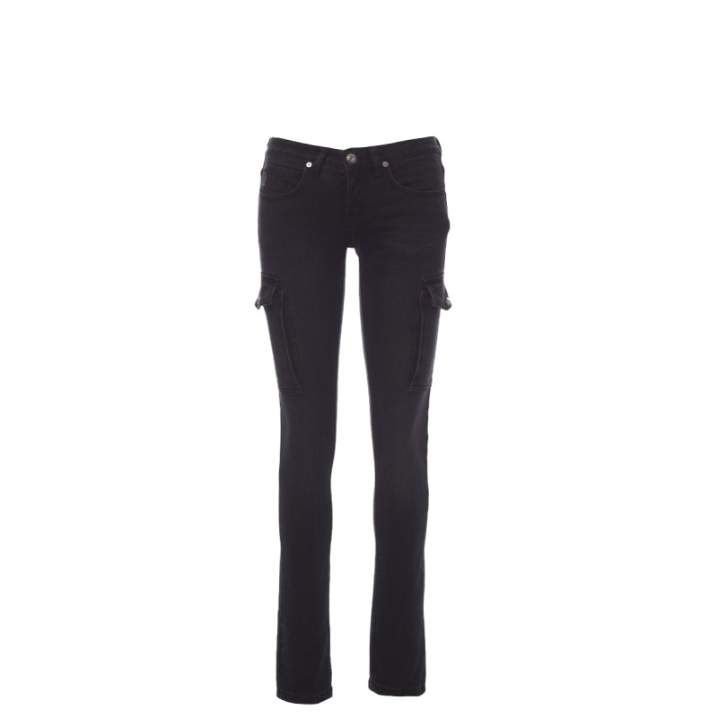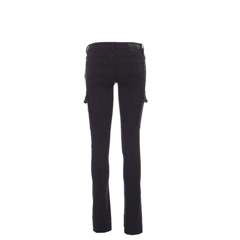 Pantalon femme, coupe jeans à cinq poches, deux poches latérales LOCK SYSTEM à petit soufflet, fermeture par zip en métal et bouton, passants à la taille, finition « lavage à la pierre » pour un effet usé et délavé. Coutures en gros fil contrasté, doubles coutures sur intérieur des jambes, jambe tube, clous et patchs en cuir véritable. Poids du tissu : 12oz/yd².