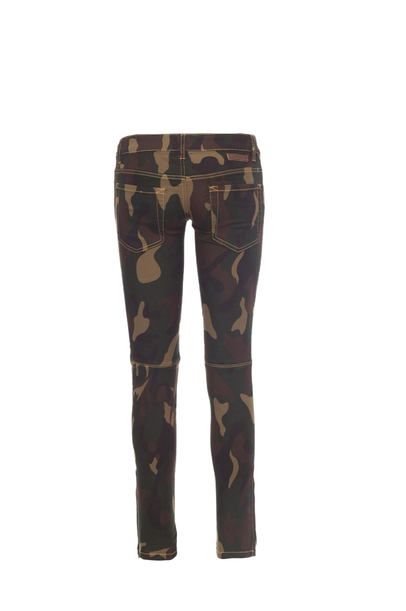 Pantalon multi-saison pour femme, coupe jeans à cinq poches et passants à la taille, fermeture par zip en métal et bouton, effet usé, coutures en gros fil contrasté, doubles coutures sur intérieur des jambes, jambes SKINNY, zip bas de jambe, clous et patch en cuir véritable. Poids du tissu: 10,50oz/yd².