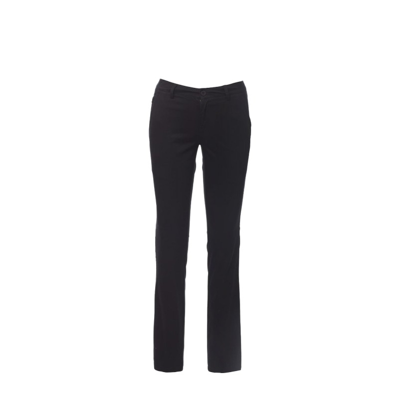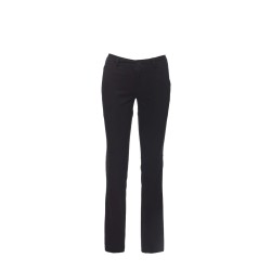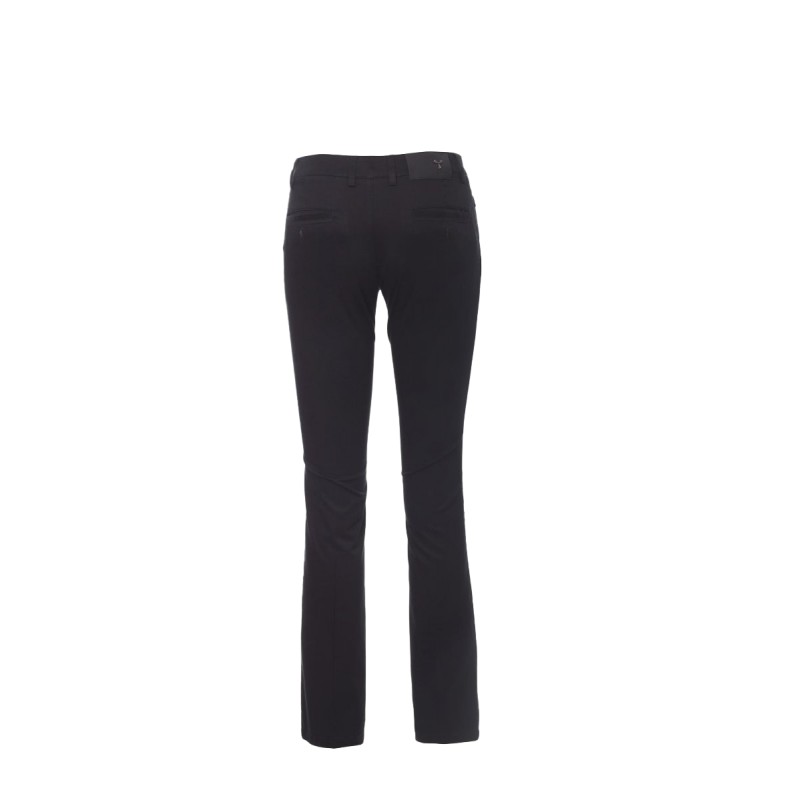Pantalon femme, coupe classique avec poches cavalières, une petite poche zippée, deux poches passepoilées à l'arrière avec bouton, zip et bouton, passants à la taille et patch en cuir véritable. Coton double retors haute densité peigné, lavage aux enzymes.