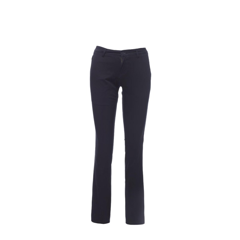 Pantalon femme, coupe classique avec poches cavalières, une petite poche zippée, deux poches passepoilées à l'arrière avec bouton, zip et bouton, passants à la taille et patch en cuir véritable. Coton double retors haute densité peigné, lavage aux enzymes.