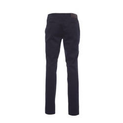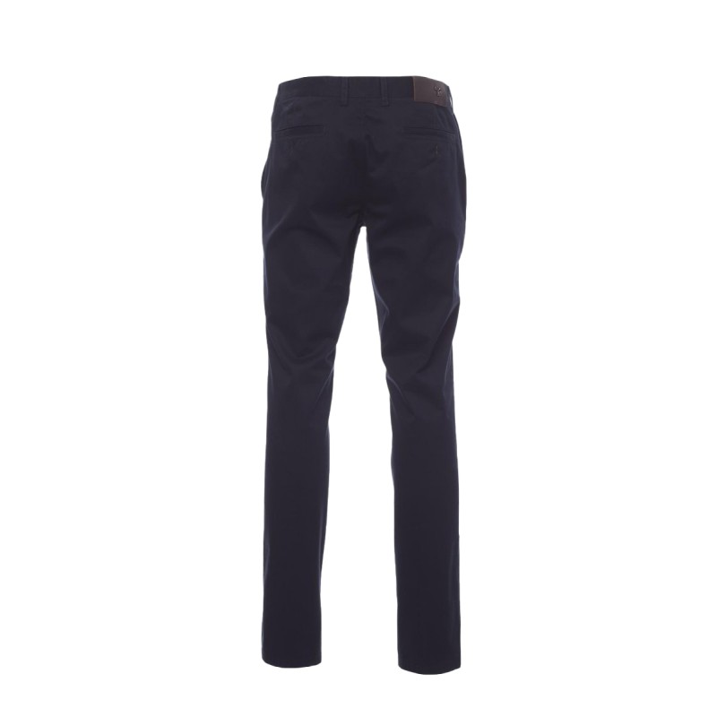 Pantalon homme, coupe classique avec poches cavalières, une petite poche zippée, deux poches passepoilées à l'arrière avec bouton, zip et bouton, passants à la taille et patch en cuir véritable. Coton double retors haute densité peigné, lavage aux enzymes.