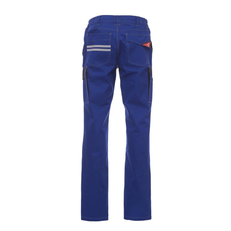 Pantalon multi-saison unisexe avec élastiques latéraux et passants à la taille, fermeture par zip et bouton en métal, deux poches de coupe classique sur le devant et une poche avec zip, une poche latérale LOCK SYSTEM, une double poche porte-mètre côté gauche, deux poches arrière une ouverte et une avec rabat et velcro. Inserts et surpiqûres en contraste, bandes réfléchissantes sur poche arrière, triple couture intérieur jambes.