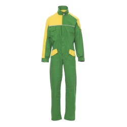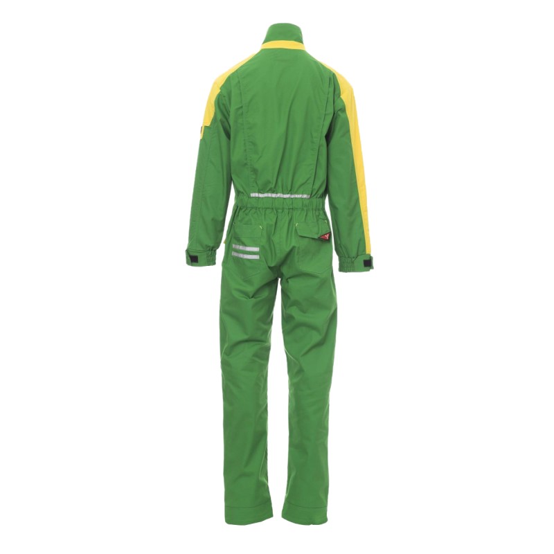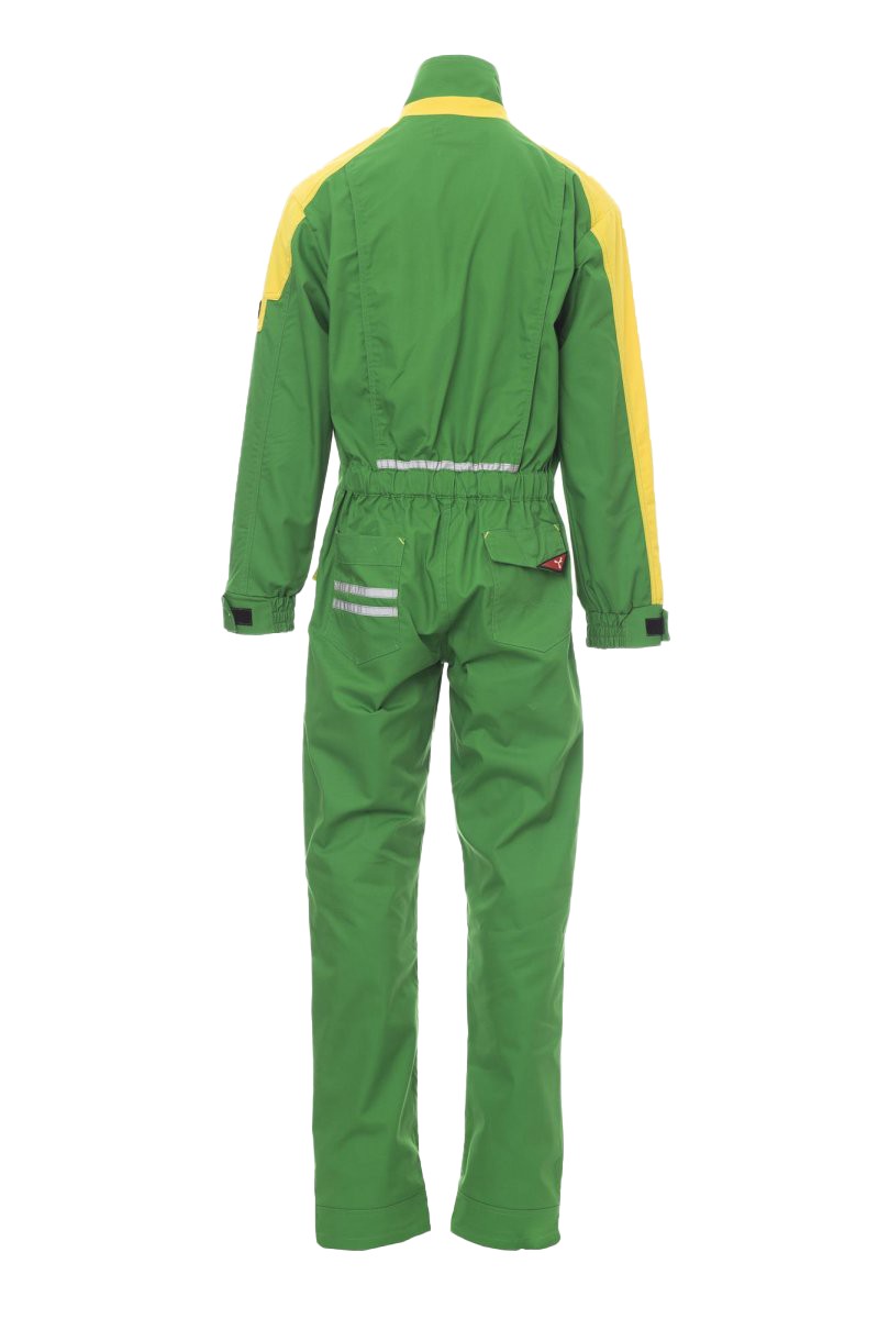 Combinaison de travail bicolore, fermeture frontale par zip, poignets avec élastique et serre-poignets avec bouton, deux poches frontales LOCK SYSTEM avec fond renforcé, une grande poche poitrine multifonction, porte-smartphone et porte-badge escamotable, deux poches arrière dont une avec rabat de fermeture et une avec deux bandes réfléchissantes, passepoil réfléchissant sur la poitrine et au niveau des reins, élastique au niveau des reins et double soufflet sur le dos pour plus de confort dans les mouvements.