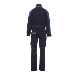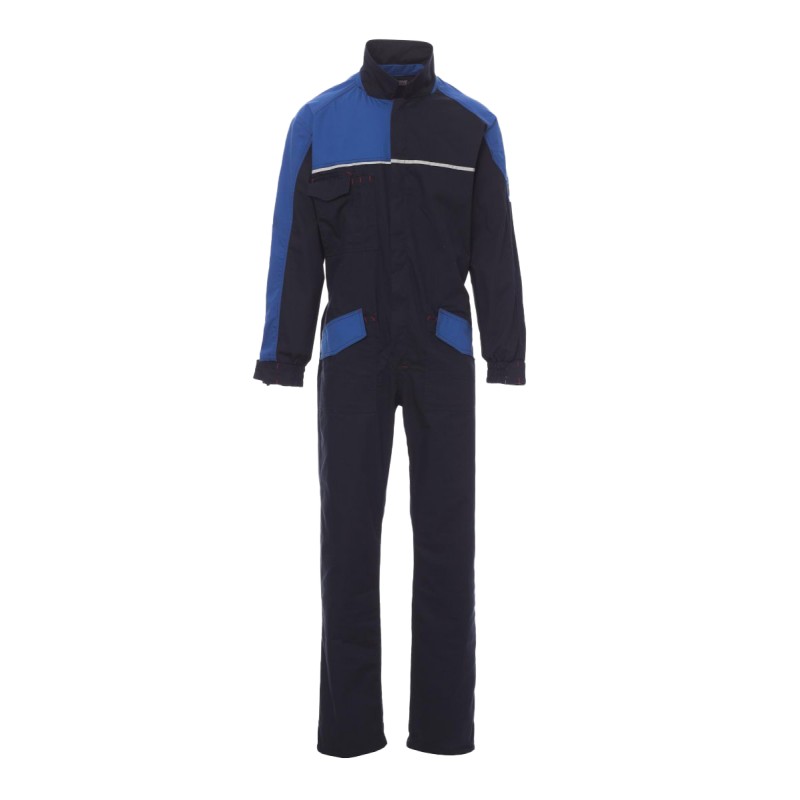 Combinaison de travail bicolore, fermeture frontale par zip, poignets avec élastique et serre-poignets avec bouton, deux poches frontales LOCK SYSTEM avec fond renforcé, une grande poche poitrine multifonction, porte-smartphone et porte-badge escamotable, deux poches arrière dont une avec rabat de fermeture et une avec deux bandes réfléchissantes, passepoil réfléchissant sur la poitrine et au niveau des reins, élastique au niveau des reins et double soufflet sur le dos pour plus de confort dans les mouvements.