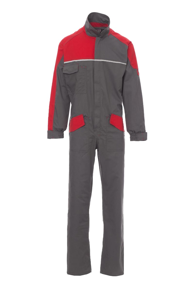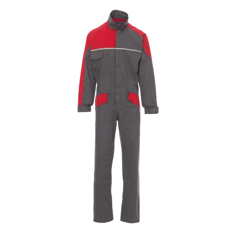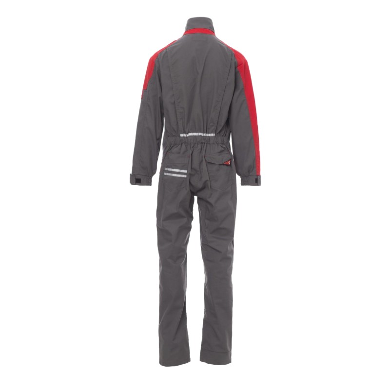 Combinaison de travail bicolore, fermeture frontale par zip, poignets avec élastique et serre-poignets avec bouton, deux poches frontales LOCK SYSTEM avec fond renforcé, une grande poche poitrine multifonction, porte-smartphone et porte-badge escamotable, deux poches arrière dont une avec rabat de fermeture et une avec deux bandes réfléchissantes, passepoil réfléchissant sur la poitrine et au niveau des reins, élastique au niveau des reins et double soufflet sur le dos pour plus de confort dans les mouvements.