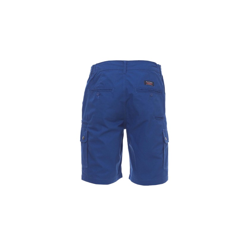Bermuda homme, élastiques latéraux et passants à la taille, fermeture éclair et bouton en métal de fermeture, deux poches de coupe classique sur le devant, deux poches latérales avec rabat et boutons-pression, une poche à fermeture éclair côté gauche, un porte-mètre escamotable côté droit, deux poches arrière passepoilées avec boutonnière et bouton.