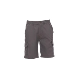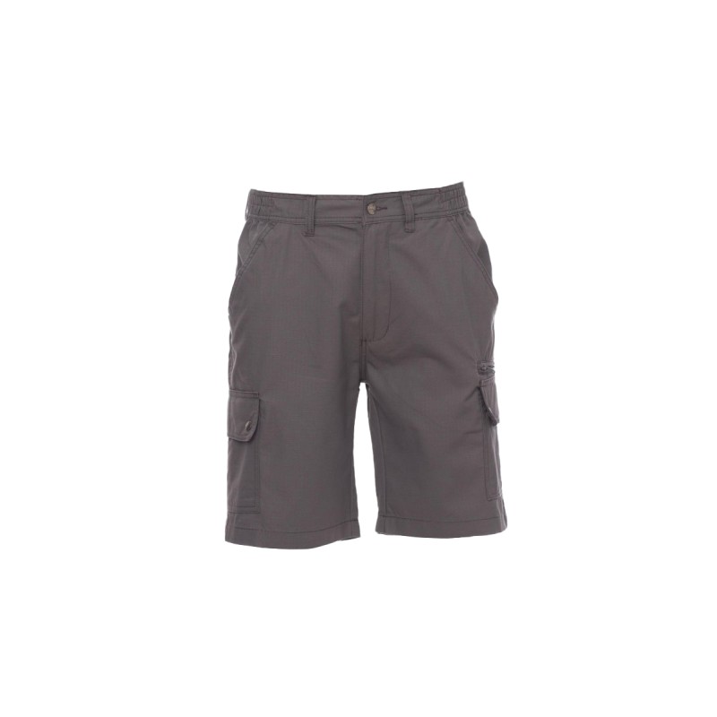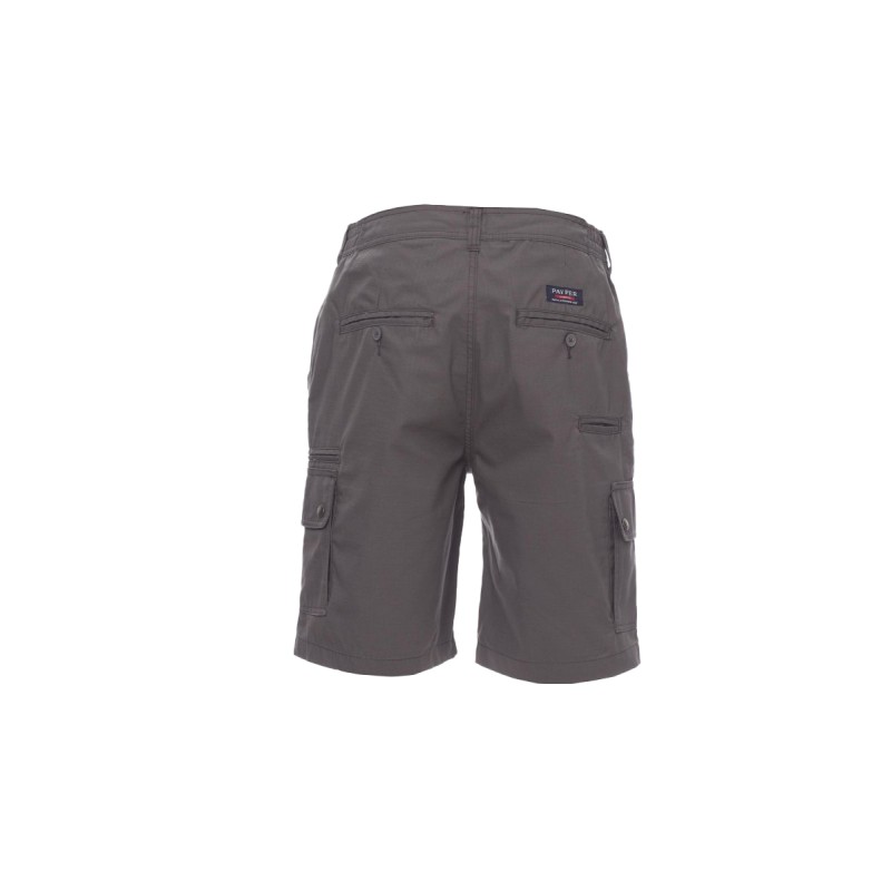 Bermuda homme, élastiques latéraux et passants à la taille, fermeture éclair et bouton en métal de fermeture, deux poches de coupe classique sur le devant, deux poches latérales avec rabat et boutons-pression, une poche à fermeture éclair côté gauche, un porte-mètre escamotable côté droit, deux poches arrière passepoilées avec boutonnière et bouton.