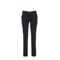 Pantalon femme, coupe classique, stretch, toutes saisons, élastiques latéraux et passants à la taille, fermeture éclair et bouton en métal de fermeture, deux poches de coupe classique sur le devant, deux poches latérales avec rabat et boutons-pression, une poche à fermeture éclair côté gauche, un porte-mètre escamotable côté droit, deux poches arrière passepoilées avec boutonnière et bouton.