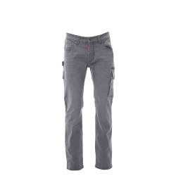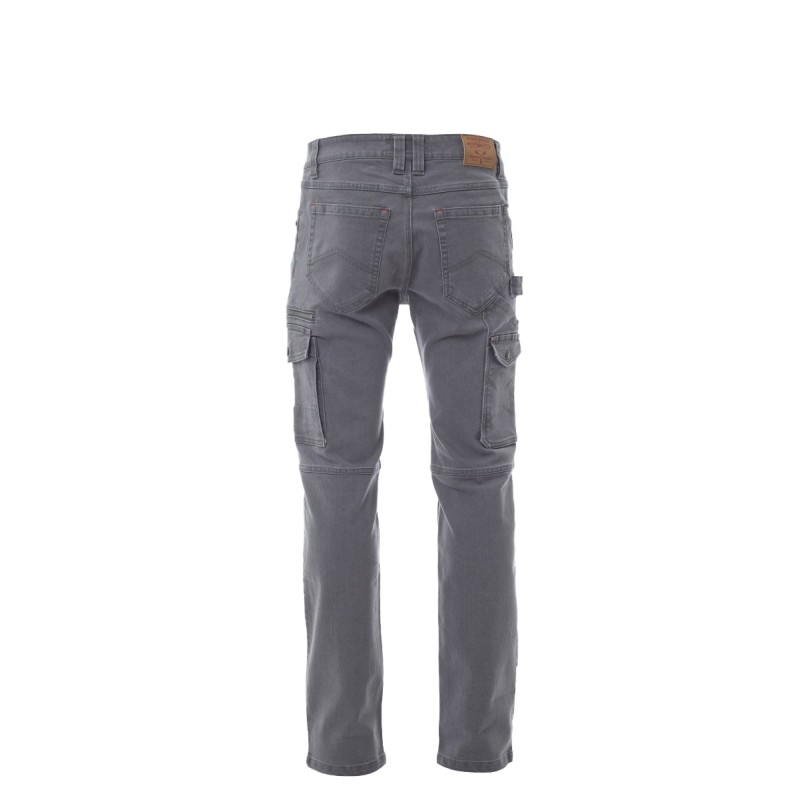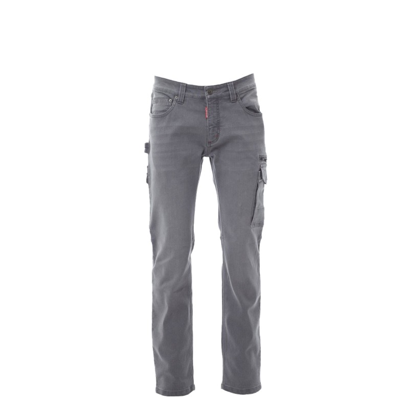 Pantalon homme multipoches, coupe jeans à cinq poches, zip en métal et bouton de fermeture, passants à la taille, 1 grande poche latérale LOCK SYSTEM renforcée à l’intérieur, 1 poche zippée, 1 porte-mètre, 1 porte-smartphone, 1 porte-marteau, 1 petite poche à crayon et cutter, finition « lavage à la pierre » pour un effet usé et délavé. Jambe tube, coutures en gros fil contrasté et triple aiguille sur intérieur des jambes. Poids du tissu : 10,50oz/yd².