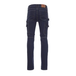Pantalon homme multipoches, coupe jeans à cinq poches, zip en métal et bouton de fermeture, passants à la taille, 1 grande poche latérale LOCK SYSTEM renforcée à l’intérieur, 1 poche zippée, 1 porte-mètre, 1 porte-smartphone, 1 porte-marteau, 1 petite poche à crayon et cutter, finition « lavage à la pierre » pour un effet usé et délavé. Jambe tube, coutures en gros fil contrasté et triple aiguille sur intérieur des jambes. Poids du tissu : 10,50oz/yd².