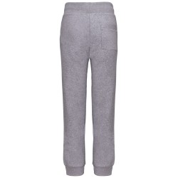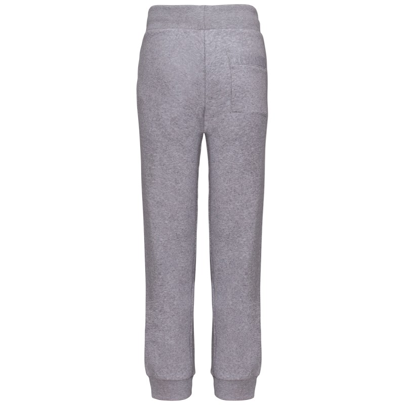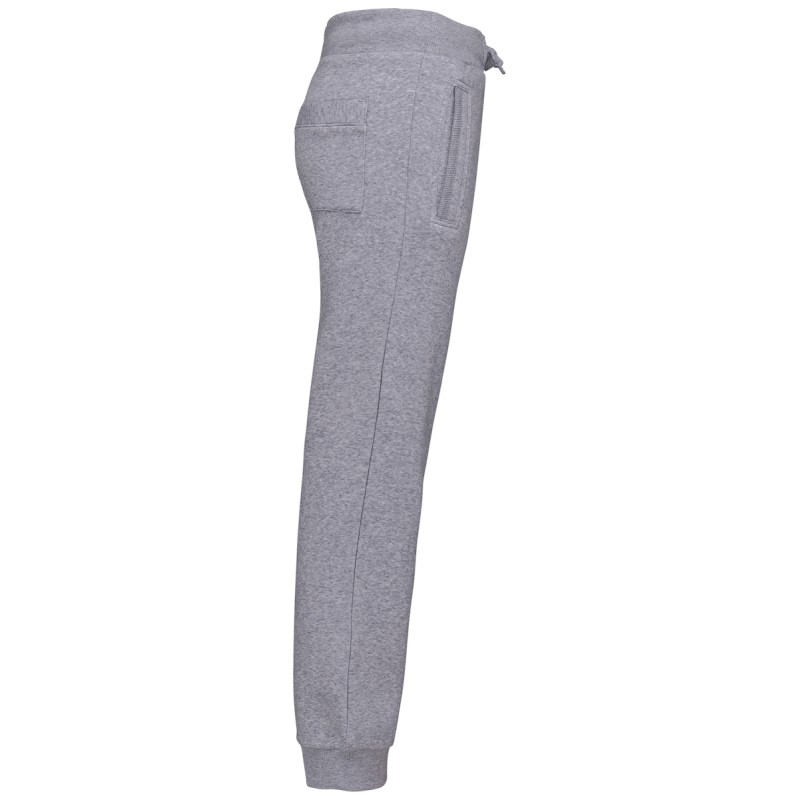 80% coton / 20% polyester. Coton peigné. Molleton gratté. 2 poches côtés et 1 poche arrière plaquée. Large bord-côte et lien de serrage à la taille. Finition bord-côte 1x1 bas de jambe.