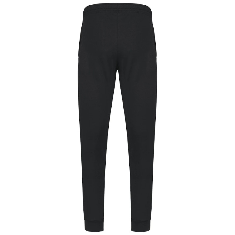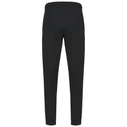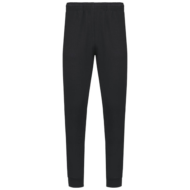80% coton / 20% polyester. Molleton gratté 2 fils. Coupe droite. 2 poches côtés. Taille élastiquée avec cordon de serrage plat. Bord côtes au bas de jambe.
