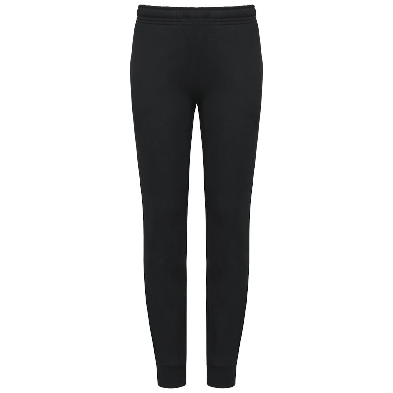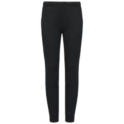 80% coton / 20% polyester. Molleton gratté 2 fils. Coupe droite. 2 poches côtés. Taille élastiquée avec cordon de serrage plat. Bord côtes au bas de jambes.