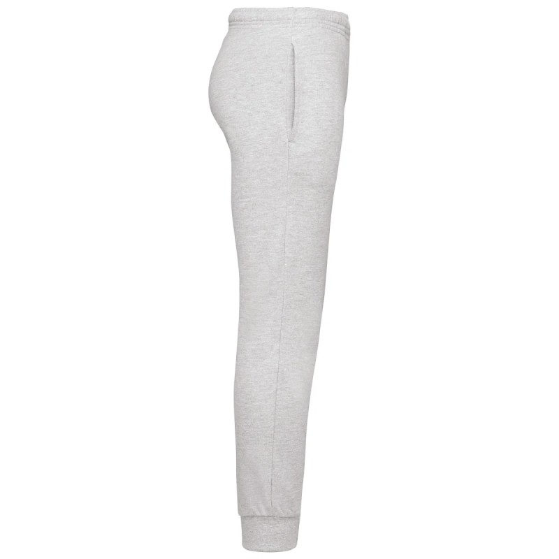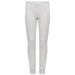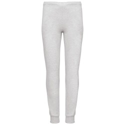 80% coton / 20% polyester. Molleton gratté 2 fils. Coupe droite. 2 poches côtés. Taille élastiquée avec cordon de serrage plat. Bord côtes au bas de jambes.