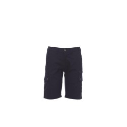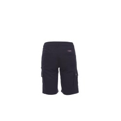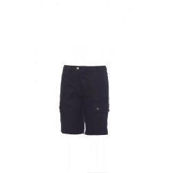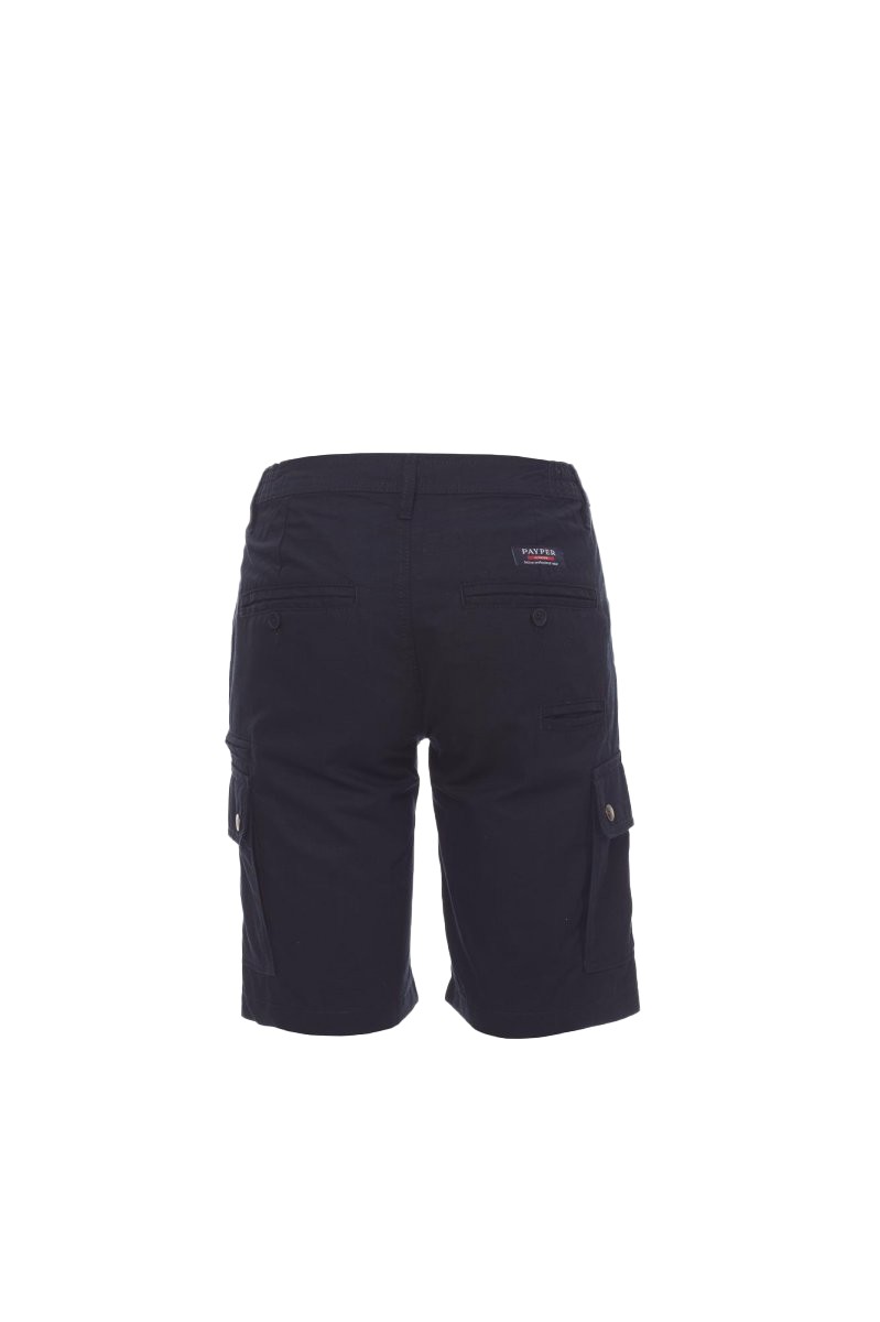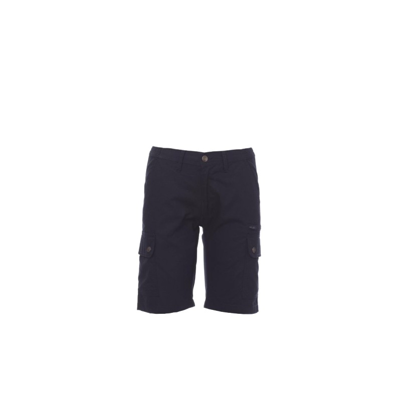 Bermuda femme, élastiques latéraux et passants à la taille, fermeture éclair et bouton en métal de fermeture, deux poches de coupe classique sur le devant, deux poches latérales avec rabat et boutons-pression, une poche à fermeture éclair côté gauche, un porte-mètre escamotable côté droit, deux poches arrière passepoilées avec boutonnière et bouton.