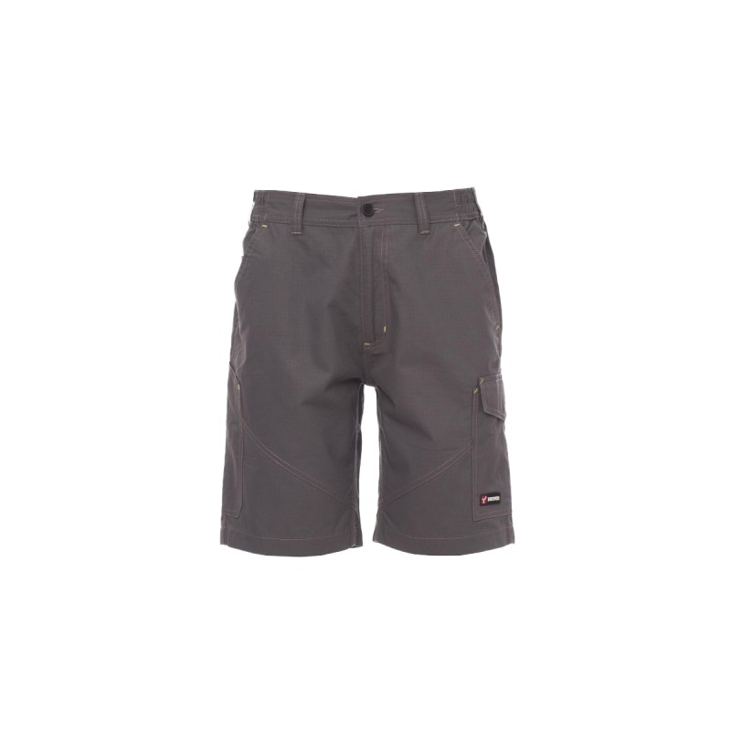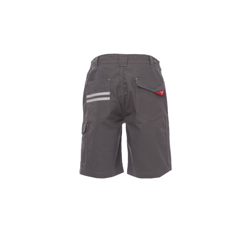 Bermuda homme, élastiques latéraux et passants à la taille, fermeture éclair et bouton en plastique, deux poches de coupe classique sur le devant, une poche latérale LOCK SYSTEM, un porte-mètre, deux poches arrière, une ouverte et une avec rabat et velcro, inserts et surpiqûres en contraste, bandes réfléchissantes sur poche arrière, triples coutures.