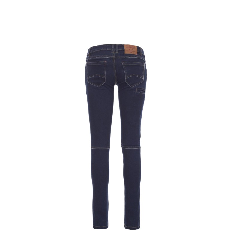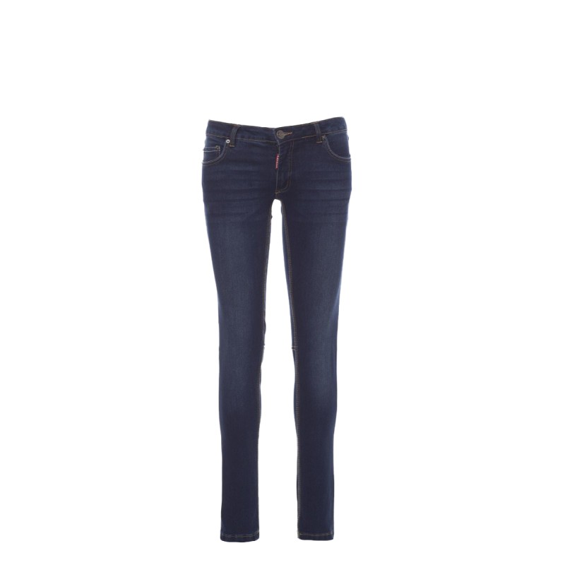 Pantalon femme, coupe jeans à cinq poches, zip en métal et bouton de fermeture, passants à la taille, 1 porte-mètre invisible, 1 petite poche porte-stylo et cutter, finition « lavage à la pierre » pour un effet usé et délavé. Jambe tube, coutures en gros fil contrasté et triple aiguille sur intérieur des jambes. Poids du tissu : 10,50oz/yd².