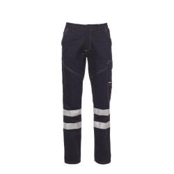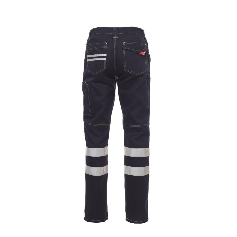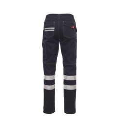 Pantalon unisexe, toutes saisons, avec bandes réfléchissantes de cat. 1, élastiques latéraux et passants à la taille, fermeture par zip et bouton en plastique, deux poches de coupe classique sur le devant, une poche latérale LOCK SYSTEM, un porte-mètre, deux poches arrière, une ouverte et une avec rabat et velcro, inserts et surpiqûres en contraste, bandes réfléchissantes sur poche arrière, triples coutures. Surpiqûres et coutures ton sur ton, avec baguettes en contraste jaune fluorescent, pour la couleur Total Noir.