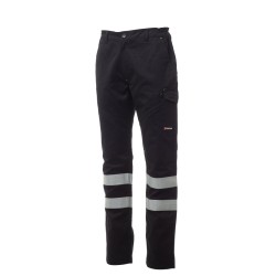 Pantalon unisexe, toutes saisons, avec bandes réfléchissantes de cat. 1, élastiques latéraux et passants à la taille, fermeture par zip et bouton en plastique, deux poches de coupe classique sur le devant, une poche latérale LOCK SYSTEM, un porte-mètre, deux poches arrière, une ouverte et une avec rabat et velcro, inserts et surpiqûres en contraste, bandes réfléchissantes sur poche arrière, triples coutures. Surpiqûres et coutures ton sur ton, avec baguettes en contraste jaune fluorescent, pour la couleur Total Noir.