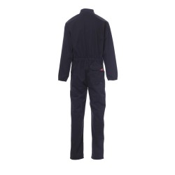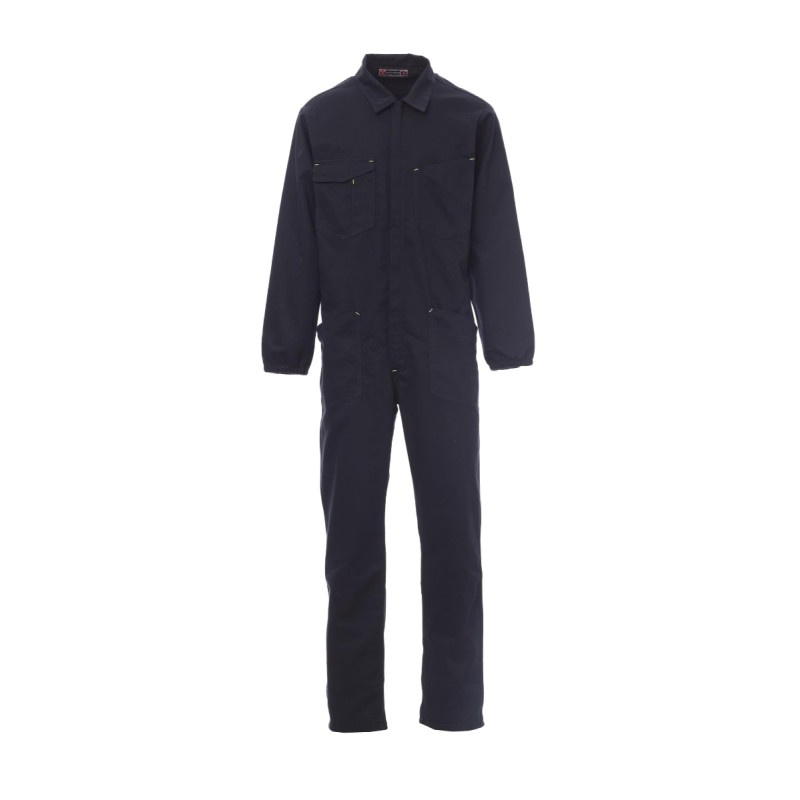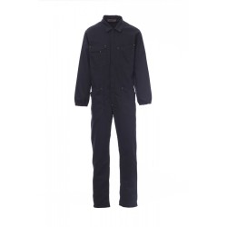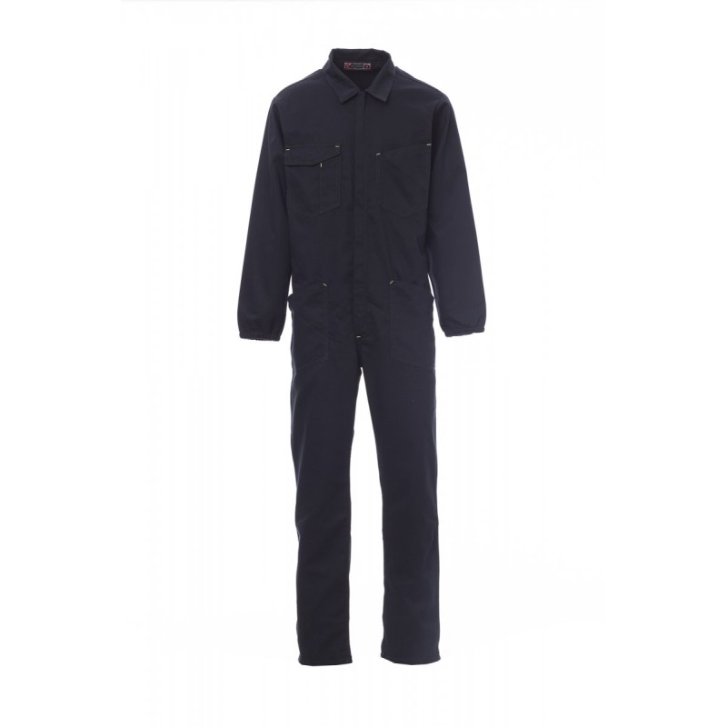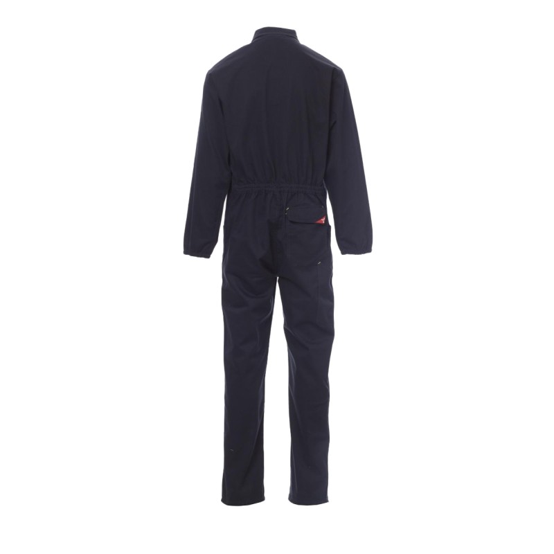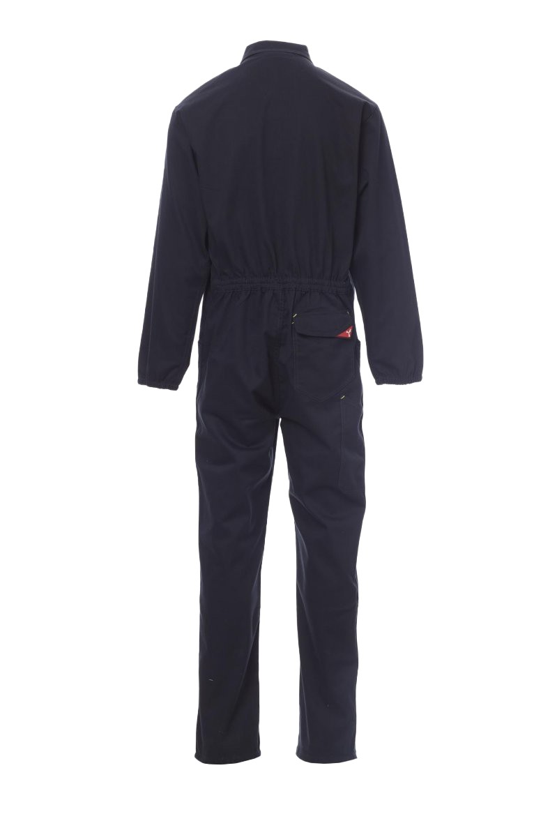 Combinaison à fermeture éclair centrale à double curseur couverte, élastique aux poignets et à la taille intérieur dos. Deux poches plaquées, deux poches sur la poitrine dont une pour smartphone, porte-badge, porte-stylo et porte-mètre. Coutures entrejambe et intérieur jambe à double aiguille.