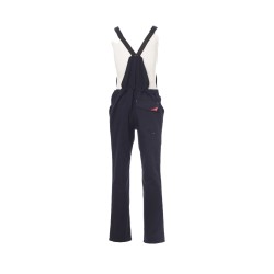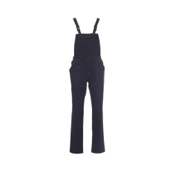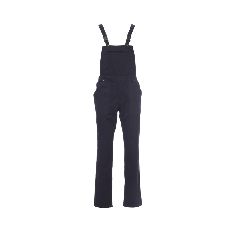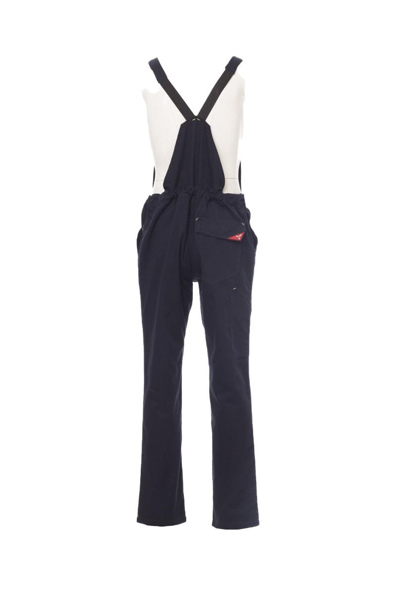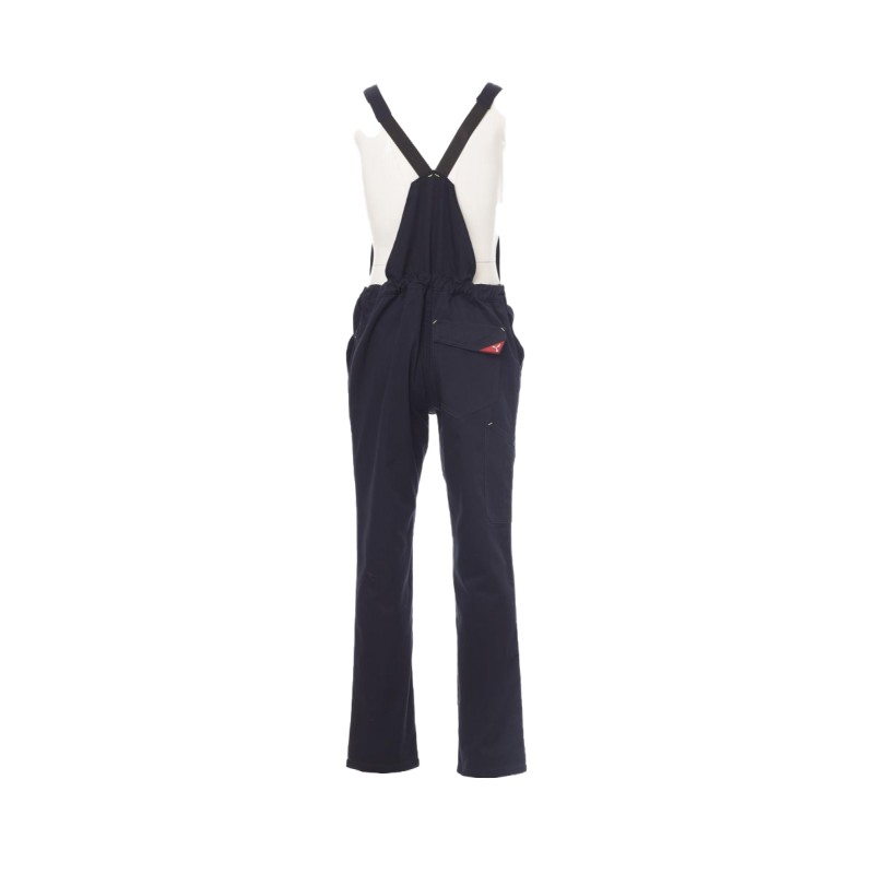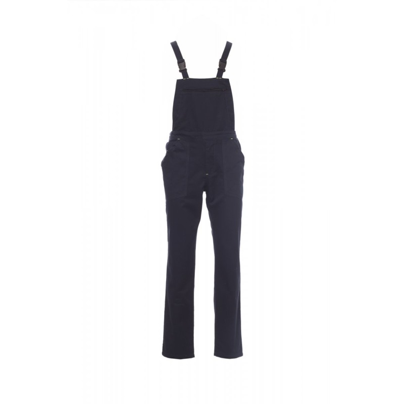 Salopette avec grande protection des reins, bretelles élastifiées et boucles à fermeture automatique, ouverture latérale avec boutons, fermeture du rabat avec fermeture éclair, élastique à la taille. Couture entrejambe et intérieur jambe à double aiguille. Poche de poitrine avec porte-badge et fermeture éclair, deux poches frontales et poche porte-stylo, poche porte-mètre latérale droite et une poche arrière avec rabat de fermeture à velcro.