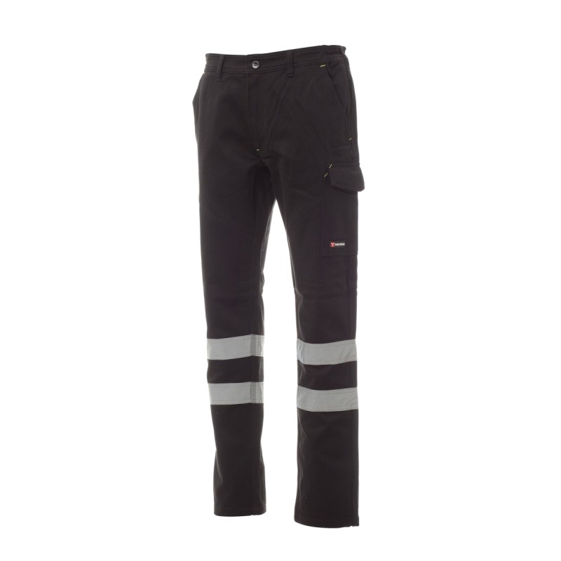 Pantalon unisexe, d'hiver, avec bandes réfléchissantes de cat. 1, élastiques latéraux et passants à la taille, fermeture par zip et bouton en plastique. Deux poches de coupe classique sur le devant, une poche latérale LOCK SYSTEM, un porte-mètre, deux poches arrière : une ouverte et une avec rabat et velcro, inserts et surpiqûres en contraste, bandes réfléchissantes sur poche arrière. Coutures triple piqûre. Surpiqûres et coutures ton sur ton, avec baguettes en contraste jaune fluorescent, pour la couleur Total Noir.