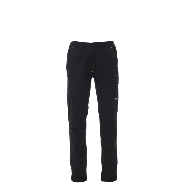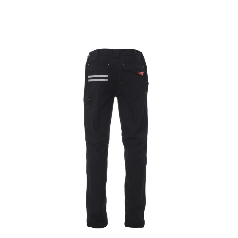 Pantalon multi-saison unisexe, élastiques latéraux et passants à la taille, fermeture par zip et bouton en plastique, deux poches de coupe classique sur le devant, une poche latérale LOCK SYSTEM, un porte-mètre, deux poches arrière, une ouverte et une avec rabat et velcro, surpiqûres assortis, bandes réfléchissantes sur poche arrière, triples coutures. Bouton à clou pour la couleur blanche.