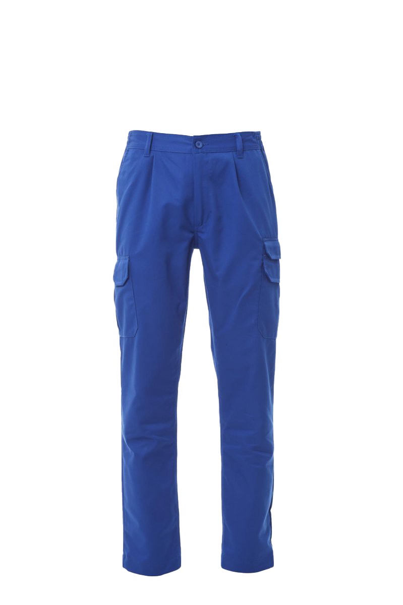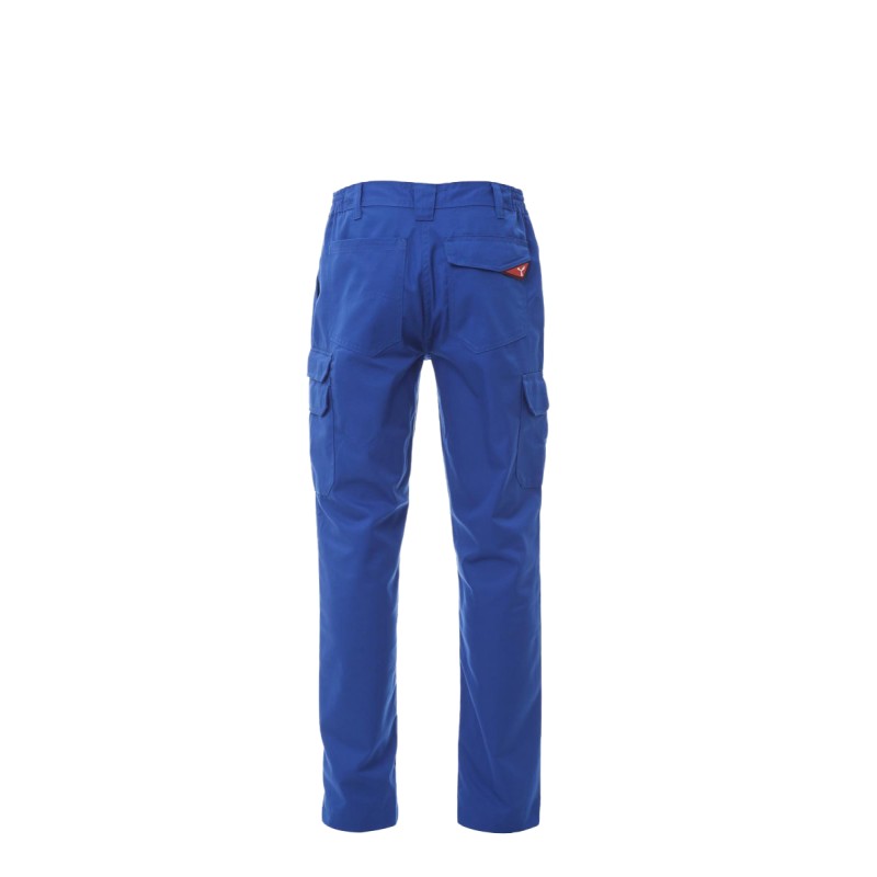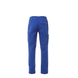 Pantalon multipoches avec élastique et passants à la taille, fermeture éclair et bouton de fermeture . Coutures entrejambe et intérieur jambe à triple aiguille, deux poches frontales de coupe classique, une poche latérale gauche avec rabat et une autre sécurisée par un zip et un rabat de couverture, une poche latérale droite avec rabat divisée en deux pour porte-mètre, deux poches arrière dont une avec rabat de fermeture.