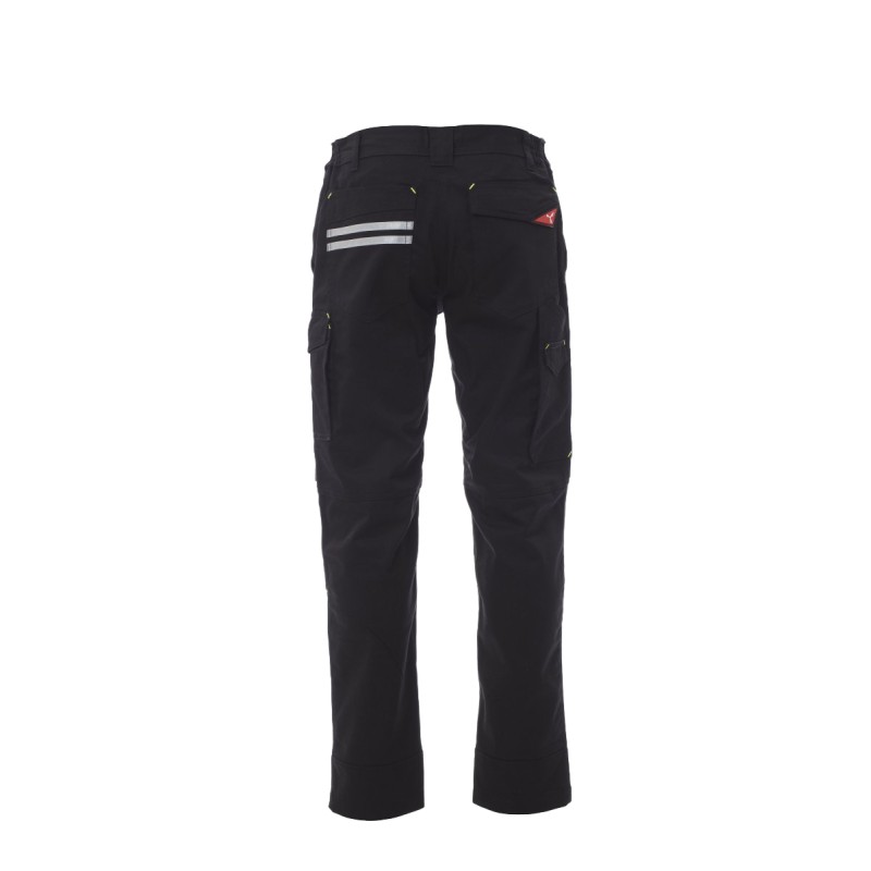 Pantalon unisexe, multi-saison avec poches genouillères, élastiques latéraux et passants à la taille, fermeture éclair et bouton en plastique, deux poches de coupe classique sur le devant, une poche latérale LOCK SYSTEM, un porte-mètre et un porte-smartphone, deux poches arrière, une ouverte et une avec rabat et velcro, inserts et surpiqûres en contraste, passepoils réfléchissants sur poche arrière, triples coutures.