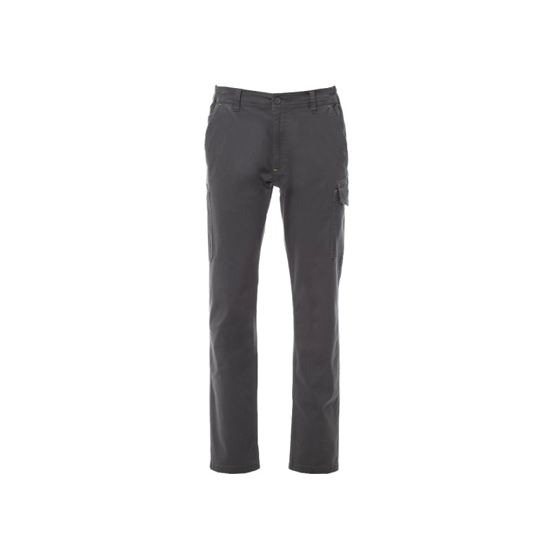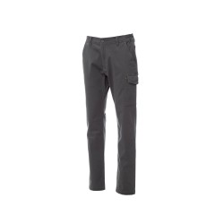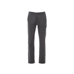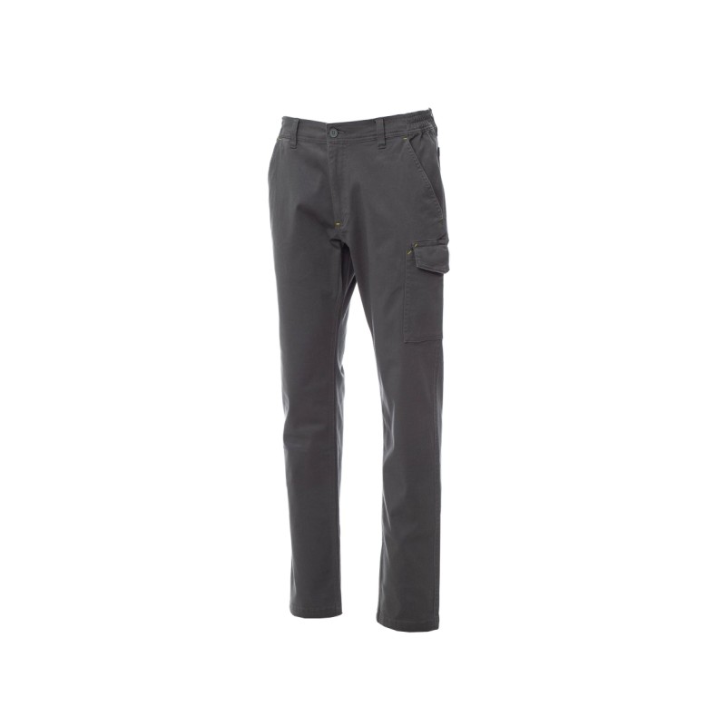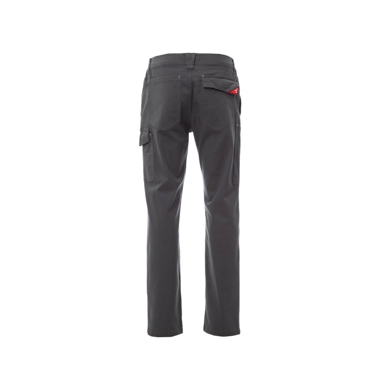 Pantalon avec passants et élastique à la taille, fermeture par zip et bouton. Deux poches de coupe classique sur le devant, petite poche porte-monnaie, porte-mètre latéral côté droit, poche latérale côté gauche avec rabat de fermeture LOCK SYSTEM, deux poches arrière dont une avec rabat et velcro. Coutures triple piqûre.