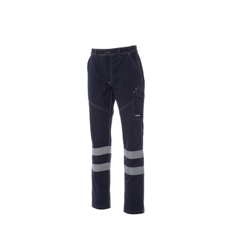 Pantalon d’été unisexe, avec bandes réfléchis-santes de cat. 1, élastiques latéraux et passants à la taille, fermeture éclair et bouton en plas-tique, deux poches de coupe classique sur le devant, une poche latérale LOCK SYSTEM, un porte-mètre, deux poches arrière, une ouverte et une avec rabat et velcro, inserts et surpiqûres en contraste, bandes réfléchissantes sur poche arrière, triples coutures. Surpiqûres et coutures ton sur ton, avec baguettes en contraste jaune fluorescent, pour la couleur Total Black.