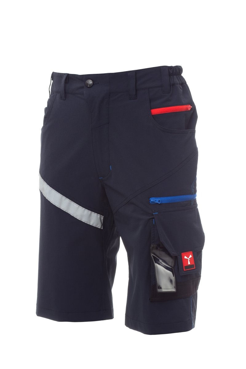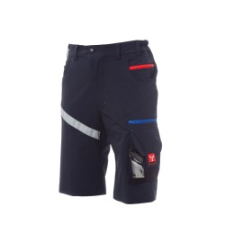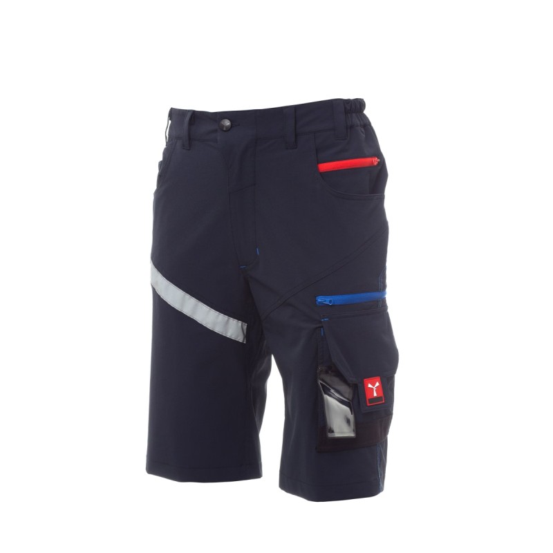 Bermuda unisexe en tissu « 4 way stretch », à élastiques latéraux et passants à la taille, fermeture à zip et bouton personnalisé. Doté sur le devant de deux poches arrondies, une petite poche porte-monnaie à droite, une petite poche de sécurité fermée par zip à gauche. L'avant de la jambe gauche comporte 3 poches : une poche horizontale fermée par zip, une poche à rabat profilé fermée par un velcro et dotée d'un porte-badge, une petite poche verticale fermée par zip. L'avant de la jambe droite présente une bande rétroréfléchissante. L'arrière comporte : une poche à rabat fermée par velcro et une poche sans rabat pourvue de 2 bandes rétroréfléchissantes, un anneau porte-marteau (jambe droite), une poche ouverte porte-mètre (jambe droite) et une poche porte-téléphone à rabat et velcro (jambe droite). Plusieurs surpiqûres latérales et baguettes de renfort en contraste sont également présentes en plusieurs points. Les tailles (italiennes) centrales 48-50-52 ont un intérieur jambe de 31 cm.