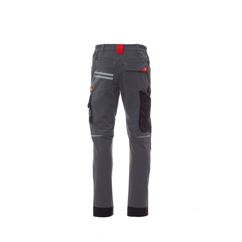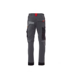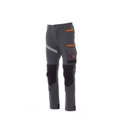 Pantalon unisexe, tissu « 4 way stretch », d'été, à élastiques latéraux et passants à la taille, fermeture à zip et bouton personnalisé. Doté sur le devant de deux poches arrondies, une petite poche porte-monnaie à droite, une petite poche de sécurité fermée par zip à gauche. L'avant de la jambe gauche comporte 3 poches : une poche horizontale fermée par zip, une poche à rabat profilé fermée par un velcro et dotée d'un porte-badge, une petite poche verticale fermée par zip. L'avant de la jambe droite présente une bande rétroréfléchissante. Les deux jambes sont dotées de porte-genouillères à ouverture par le haut. L'arrière comporte : une poche à rabat fermée par velcro et une poche sans rabat pourvue de 2 bandes rétroréfléchissantes, un anneau porte-marteau (jambe droite), une poche ouverte porte-mètre (jambe droite) et une poche porte-téléphone à rabat et velcro (jambe droite), des inserts rétroréfléchissants au niveau du genou (sur les deux jambes), talonnette en tissu en contraste (sur les deux jambes). Plusieurs surpiqûres latérales et baguettes de renfort en contraste sont également présentes en plusieurs points. Les tailles (italiennes) centrales 48-50-52 ont un intérieur jambe habituel de 82 cm.